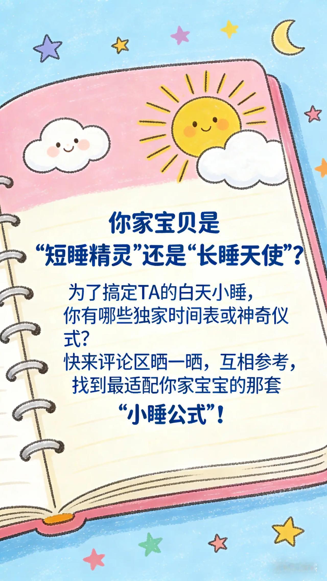 小睡奥秘:让白天的充电时光更高效。爸爸妈妈们,有没有发现宝宝白天小睡总是状况百出?要么睡一会儿就醒,怎么哄都不睡了,导致白天睡眠时间不足;要么白天睡太久,晚上又精神得睡不着,打乱了夜间睡眠。你们看着宝宝睡眠不规律,既担心影响宝宝的生长发育,又不知道该如何调整宝宝的白天小睡习惯。科学原理0 - 3 岁宝宝的睡眠需求因年龄而异,不同阶段需要合适的白天小睡时长和次数来保证整体睡眠充足。宝宝白天小睡时间短,可能是因为外界干扰过多,或者没有养成良好的小睡习惯。而白天睡太久,会影响夜间的睡眠驱动力,导致晚上难以入睡。根据 AAP 的研究,合理安排白天小睡,对宝宝的身体和大脑发育至关重要。具体方法规律小睡时间:根据宝宝年龄确定小睡次数和时间。例如,0 - 6 个月宝宝每天可能需要 3 - 4 次小睡,每次 1 - 2 小时;6 - 12 个月宝宝每天 2 - 3 次小睡;1 - 3 岁宝宝每天 1 - 2 次小睡。固定每天小睡的时间,比如上午 10 点和下午 2 点左右各睡一次,让宝宝的身体适应这个节奏。营造小睡环境:白天小睡时,拉上窗帘,调暗光线,营造类似夜间的睡眠氛围。保持安静,但也无需绝对安静,让宝宝适应正常生活中的一些声音,避免宝宝对过于安静的环境产生依赖。可以给宝宝使用睡袋,增加安全感,让宝宝睡得更踏实。常见误区误区一:强迫宝宝小睡。如果宝宝在小睡时间没有困意,家长强行让宝宝躺在床上,宝宝可能会感到烦躁,反而更难以入睡。可以观察宝宝的状态,如果宝宝不困,可以适当推迟小睡时间,但要注意控制在合理范围内,避免影响晚上睡眠。误区二:白天小睡不做任何安排。没有规律的小睡时间和环境,宝宝很难养成良好的小睡习惯。要像安排晚上睡眠一样,重视白天小睡的规律性和环境营造。互动问题:你家宝宝白天小睡最长能睡多久呢?分享一下你是怎么调整宝宝白天小睡习惯的。育儿经验分享 新手爸妈必看 新手父母必看 宝宝睡眠