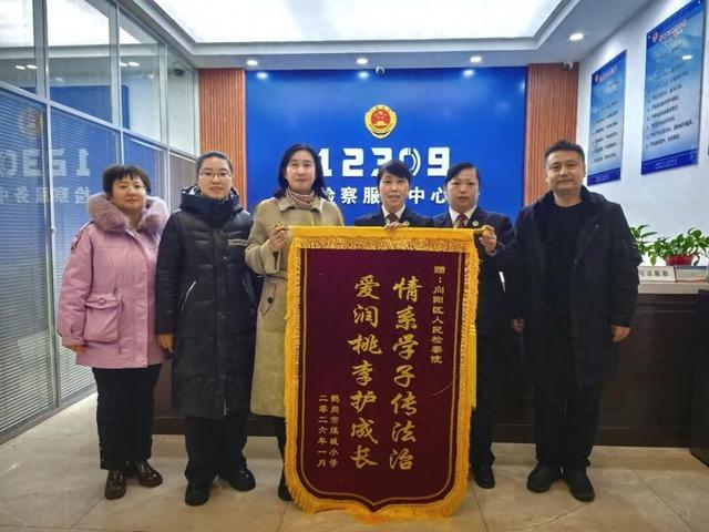 “常年送法进校园,法治护航助成长,检察人员的用心付出,我们全校师生都看在眼里、记在心里!”1月12日,辖区煤城小学校长邸士秀带领校领导班子及教师代表走进鹤岗市向阳区人民检察院,将一面镌刻“情系学子传法治,爱润桃李护成长”的锦旗郑重递交到检察人员手中,以质朴真挚的方式,表达全校师生对检察机关长期深耕校园法治教育、护航未成年人健康成长的深切谢意。