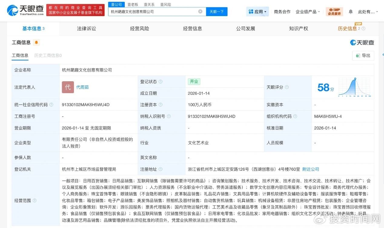 天眼查工商信息显示,近日,杭州葩趣文化创意有限公司成立,法定代表人为代雨茹,注册资本100万人民币,经营范围含日用百货销售、日用品销售、互联网销售、人力资源服务、商务代理代办服务、个人商务服务、电子产品销售、机械设备租赁等。