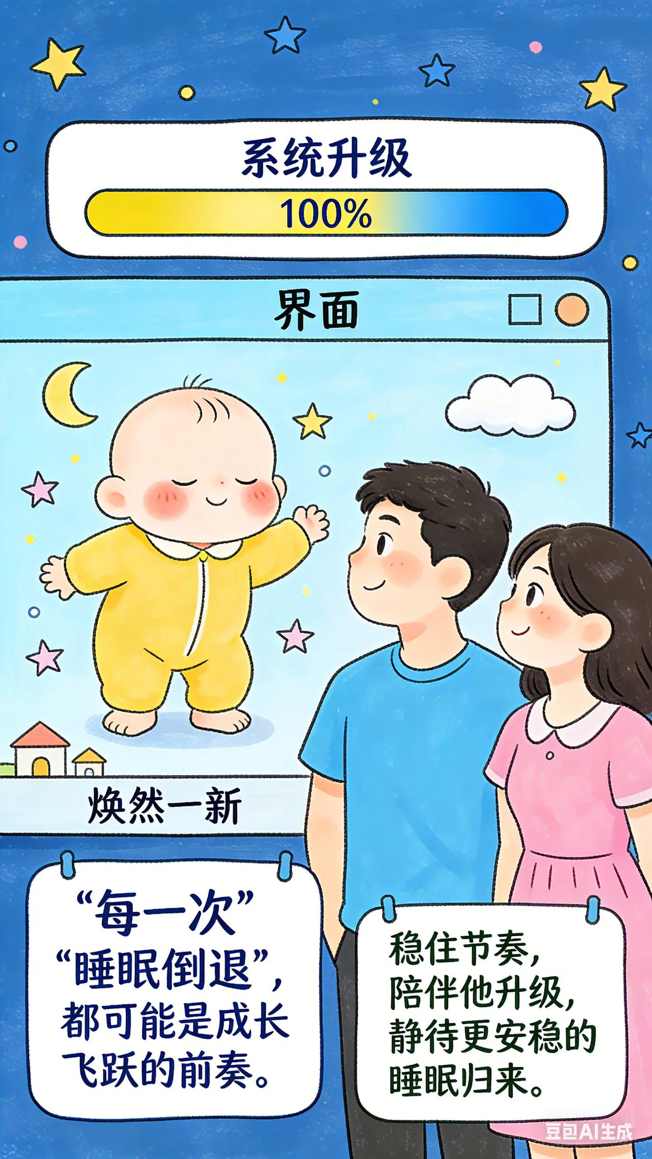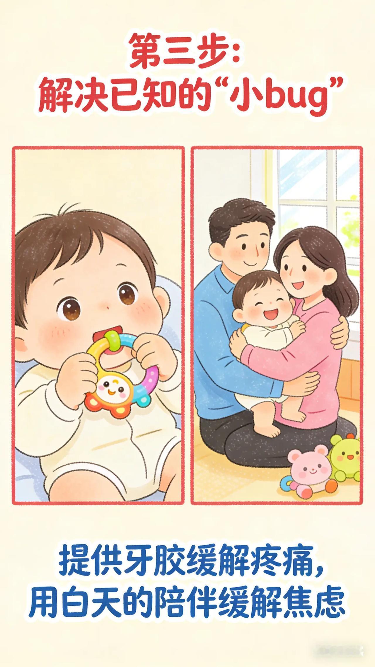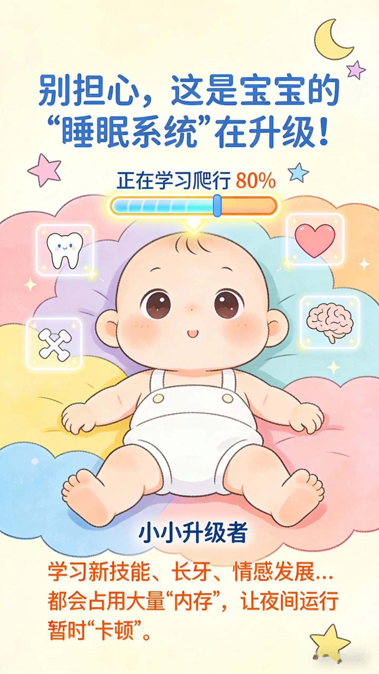 陪宝宝度过“睡眠系统升级期”。爸爸妈妈们,是不是突然发现原本睡眠规律的宝宝,在某一阶段开始出现睡眠问题,比如入睡困难、频繁夜醒,就像之前建立的睡眠习惯突然被打乱了一样?这可能是宝宝进入了睡眠倒退期。看着宝宝睡眠质量变差,你们心急如焚,却又不明白为什么会这样,更不知道该如何应对。科学原理0 - 3 岁的宝宝在成长过程中,会经历多个睡眠倒退期,常见于 4 个月、8 - 10 个月、12 个月、18 个月左右。这是因为宝宝在这些阶段身体和大脑发育迅速,比如 4 个月左右宝宝开始学习翻身、8 - 10 个月可能正在学爬或学站,这些新技能的掌握会让宝宝大脑处于兴奋状态,影响睡眠。此外,出牙不适、分离焦虑等因素也会导致睡眠倒退。具体方法保持耐心与安抚:睡眠倒退期宝宝可能会因为不适或焦虑而哭闹,家长要保持耐心,给予宝宝更多的安抚。可以通过轻柔的抚触、温柔的言语安慰宝宝,让宝宝感受到安全和舒适。巩固睡眠习惯:坚持之前建立的睡眠规律和睡眠仪式,如固定的睡觉时间、睡前故事等。不要因为宝宝睡眠倒退就随意改变,这有助于让宝宝重新找回睡眠节奏。比如,即使宝宝夜醒频繁,每次醒来也尽量按照平时的安抚方式哄睡,不要增加额外的哄睡手段,以免让宝宝养成不良习惯。缓解不适:如果宝宝是因为出牙不适导致睡眠问题,可以给宝宝提供牙胶、磨牙棒等缓解疼痛。若宝宝有分离焦虑,家长可以在宝宝入睡前多陪伴一会儿,在宝宝睡着后再离开。白天也可以多和宝宝互动,增加宝宝的安全感。常见误区误区一:认为睡眠倒退期无需干预。虽然睡眠倒退期具有一定阶段性,但适当的干预可以帮助宝宝更平稳地度过,减少对宝宝和家长睡眠的影响。如果不采取措施,宝宝可能会因为睡眠问题影响身体和大脑发育。误区二:为了让宝宝快速入睡而过度干预。比如,频繁喂奶、长时间摇晃哄睡等,这些过度的干预可能会让宝宝在睡眠倒退期过后仍然依赖这些方式入睡,破坏之前建立的良好睡眠习惯。要尽量采用温和、适度的安抚方式。互动问题:你家宝宝在睡眠倒退期出现的最突出睡眠问题是什么?你是怎么应对的呢?快来评论区分享,让更多家长受益。睡眠倒退期 宝宝成长 分离焦虑 出牙期