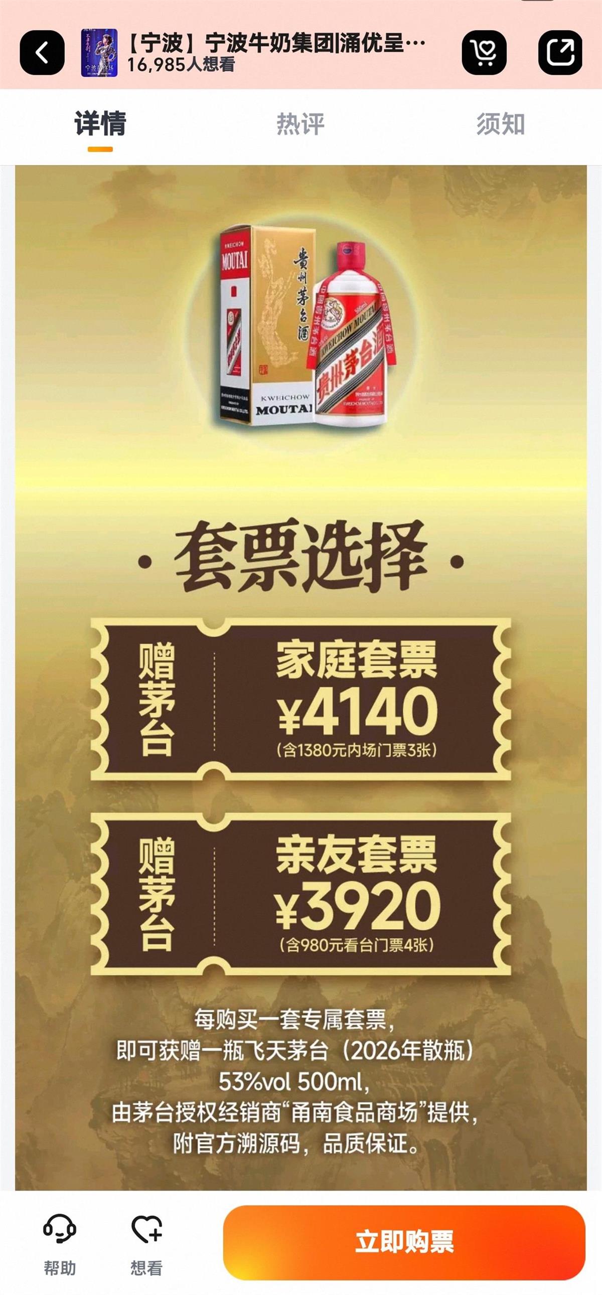 票务网站显示,“不要告别”演唱会宁波最终场已于2025年11月17日开票,门票分为看台的480元、680元、780元、980元,内场的1380元等多个价位。此外还包括4140元的内场3人套票、3920元的看台4人套票。每购买一套专属套票,即可获赠一瓶53度500毫升的飞天茅台(2026年散瓶),套票开售时间为2025年12月29日,目前已售罄。成功购票者需于2026年1月15日至18日前往线下指定点领取赠品,赠品由茅台授权经销商“甬南食品商场”提供,附官方溯源码。