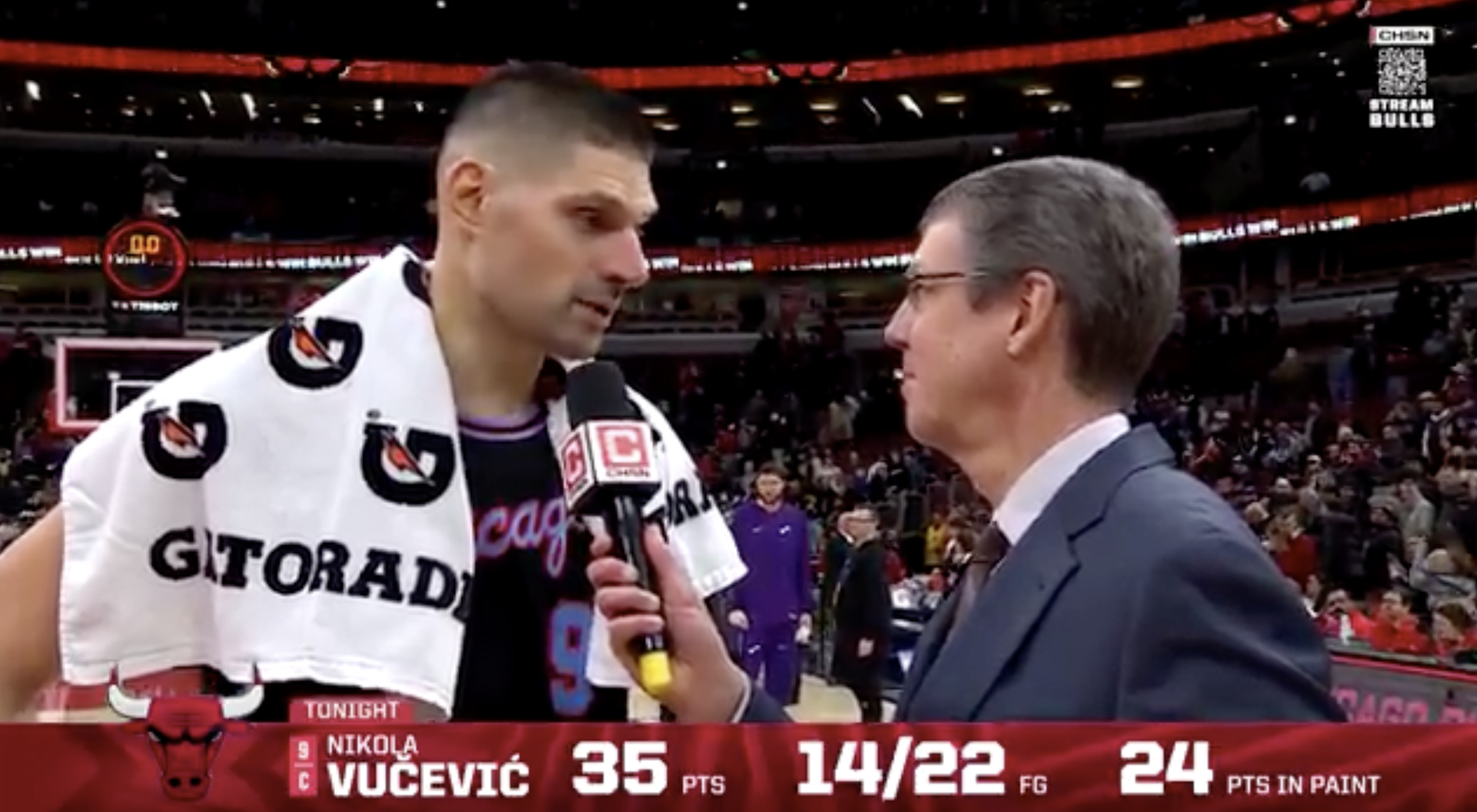 本场比赛,公牛球员尼古拉-武切维奇出战30分钟,22投14中,其中三分球6投2中,罚球6投5中,得到35分7篮板5助攻2封盖,,比赛最后4秒完成准绝杀。