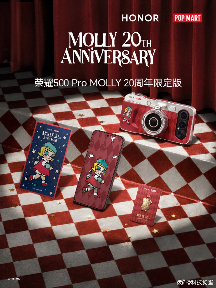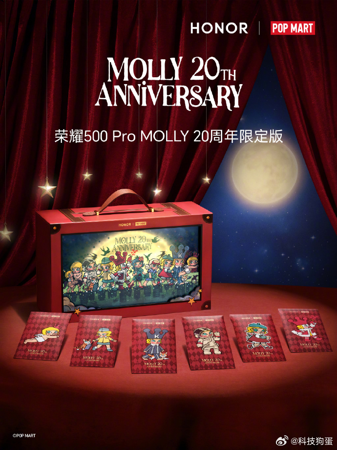 荣耀500 Pro和泡泡玛特的MOLLY合作的20周年限定版礼盒,大家觉得咋样?荣耀最近的联名挺会拿捏受众人群啊,既做年轻化,又做高端保时捷联名。但狗蛋这次20周年觉得选MOLLY联动,不如选DIMOO,这个IP更火,而且选黑色背屏,不如选白色的,会有不少小姐姐喜欢的
