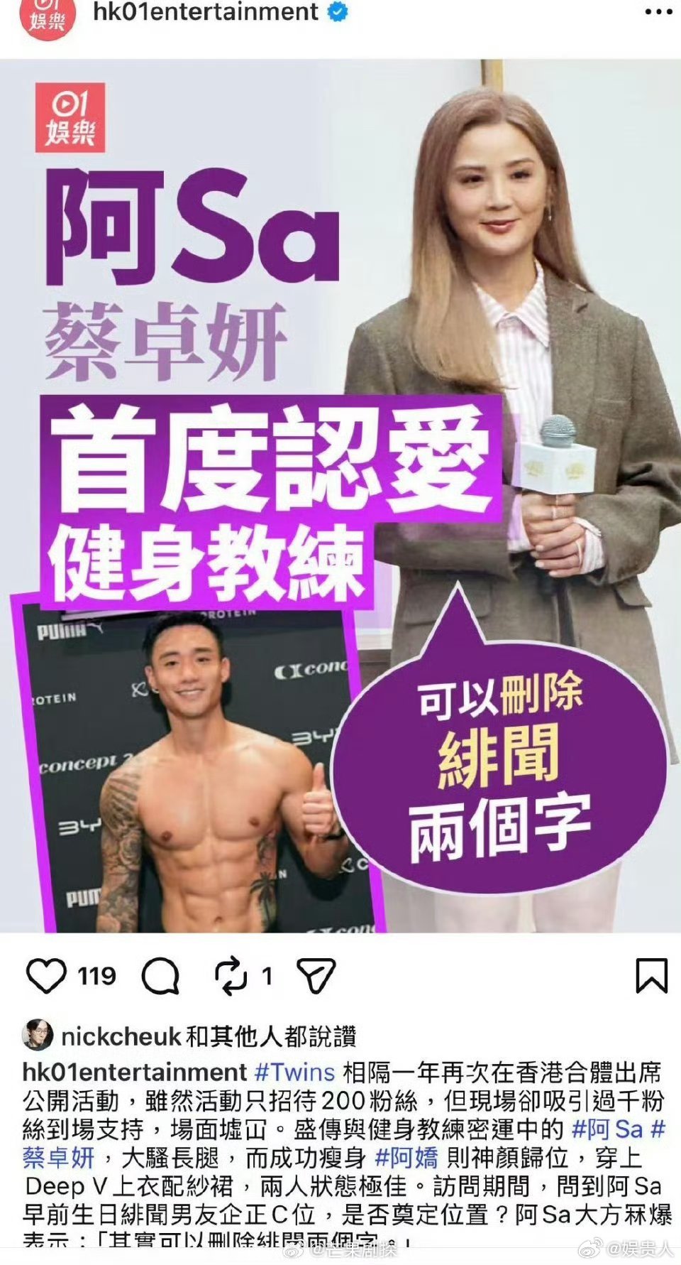 蔡卓妍承认健身教练是男友蔡卓妍公开承认恋情 蔡卓妍公开承认恋情,健身教练是男友