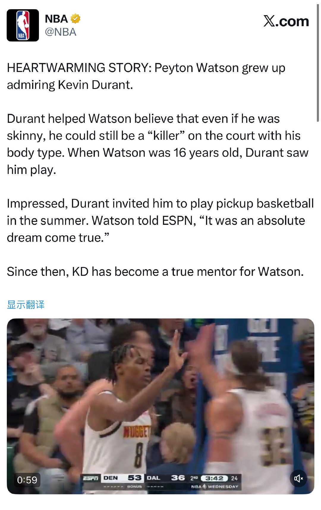 杜兰特在沃特森近期获得周最佳球员奖后,发ins对沃特森大加称赞。【NBA官方:暖心故事 - 佩顿·沃特森自小视凯文·杜兰特为偶像。】杜兰特曾激励沃特森,让他相信即使身材瘦削,也能凭借自身体型在球场上成为“赛场杀器”。沃特森16岁时,杜兰特曾现场观看他的比赛。杜兰特对其表现印象深刻,便邀请他在夏天一同打野球。沃特森告诉ESPN:“这绝对是我梦想成真的时刻。”自那以后,杜兰特便成了沃特森名副其实的良师益友。休斯顿火箭休斯顿火箭