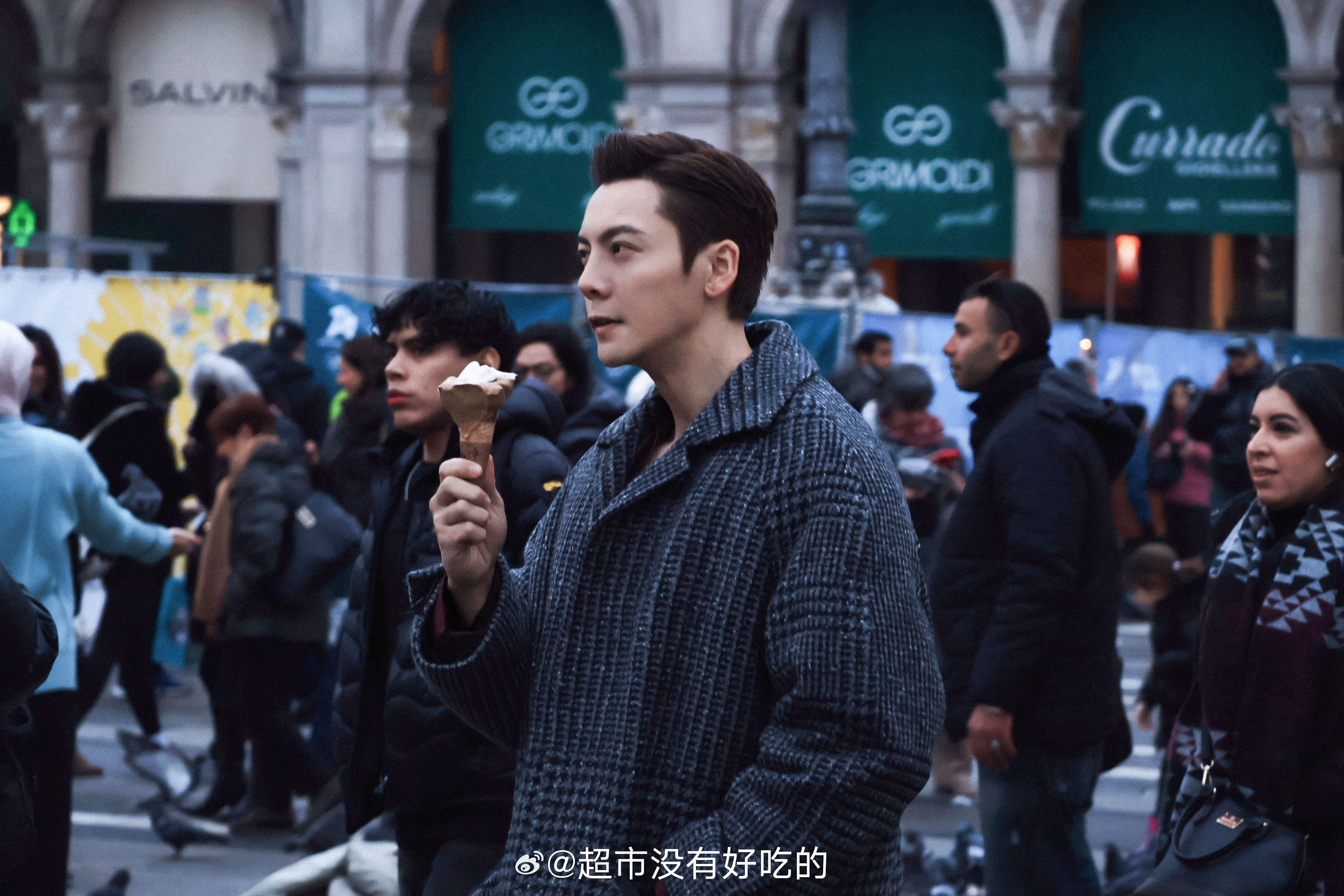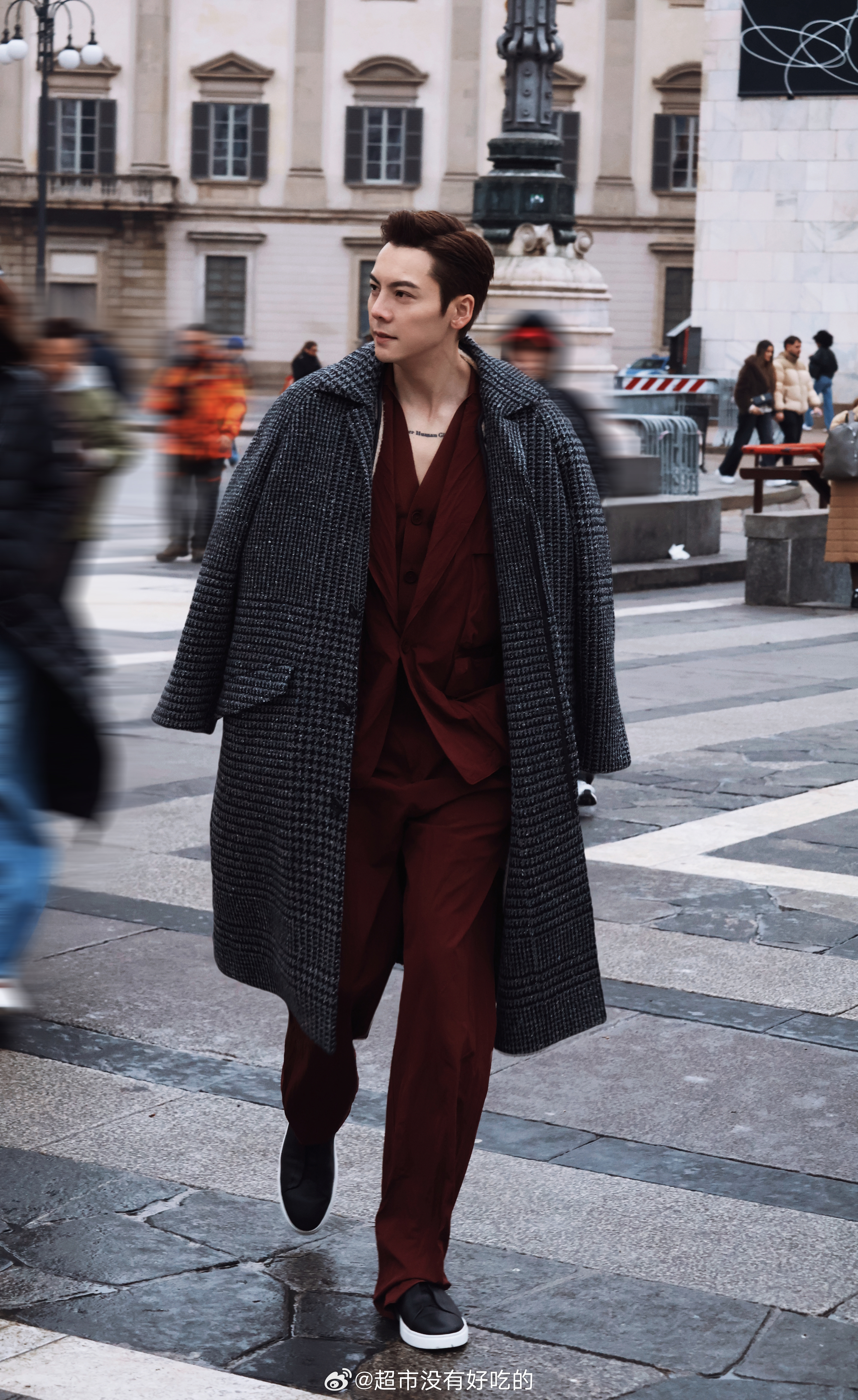 陈伟霆意大利米兰街拍,杰尼亚Zegna 深v西装搭大衣,造型矜贵时尚又霸气利落,