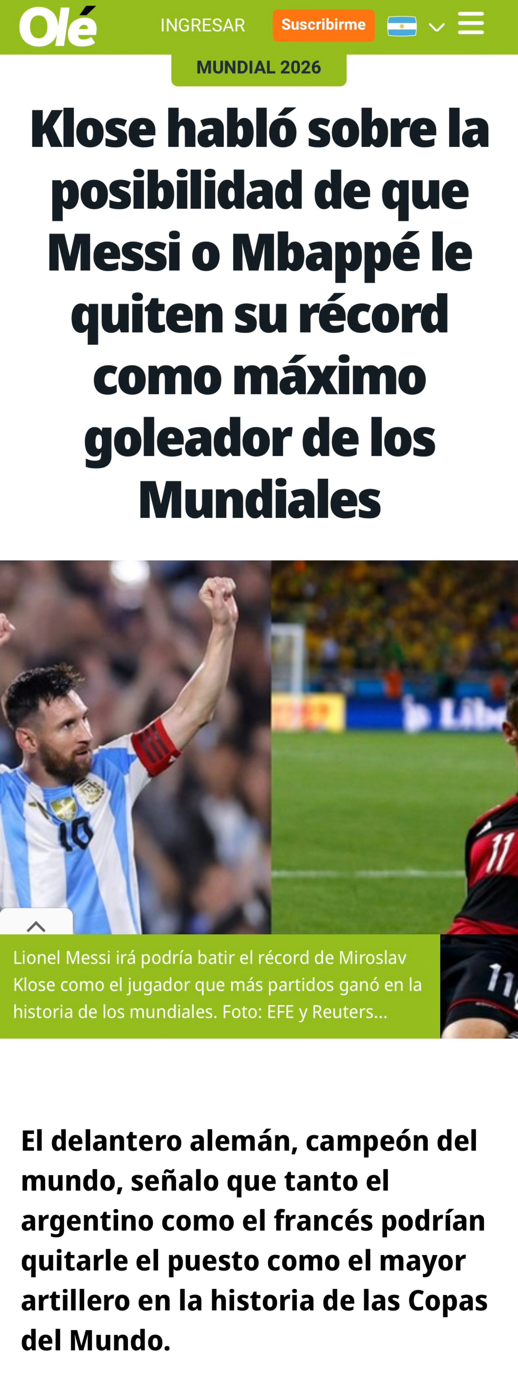 🎙梅西和姆巴佩,谁会打破你的历史纪录?🇩🇪克洛泽:“我是梅西的超级粉丝,如果我能为任何人许愿,那一定是梅西,只要他还在踢球。但姆巴佩也是一位天赋异禀的球员,我祝愿他们俩身体健康,发挥出最佳水平。”目前世界杯最佳射手:Miroslav Klose (Alemania): 16 golesRonaldo (Brasil) – 15 golesGerd Müller (Alemania) – 14 golesJust Fontaine (Francia) – 13 golesLionel Messi (Argentina) – 13 golesKylian Mbappé (Francia) – 12 golesPelé (Brasil) – 12 golesJürgen Klinsmann (Alemania) – 11 golesSándor Kocsis (Hungría) – 11 golesGabriel Batistuta (Argentina) – 10 goles梅西