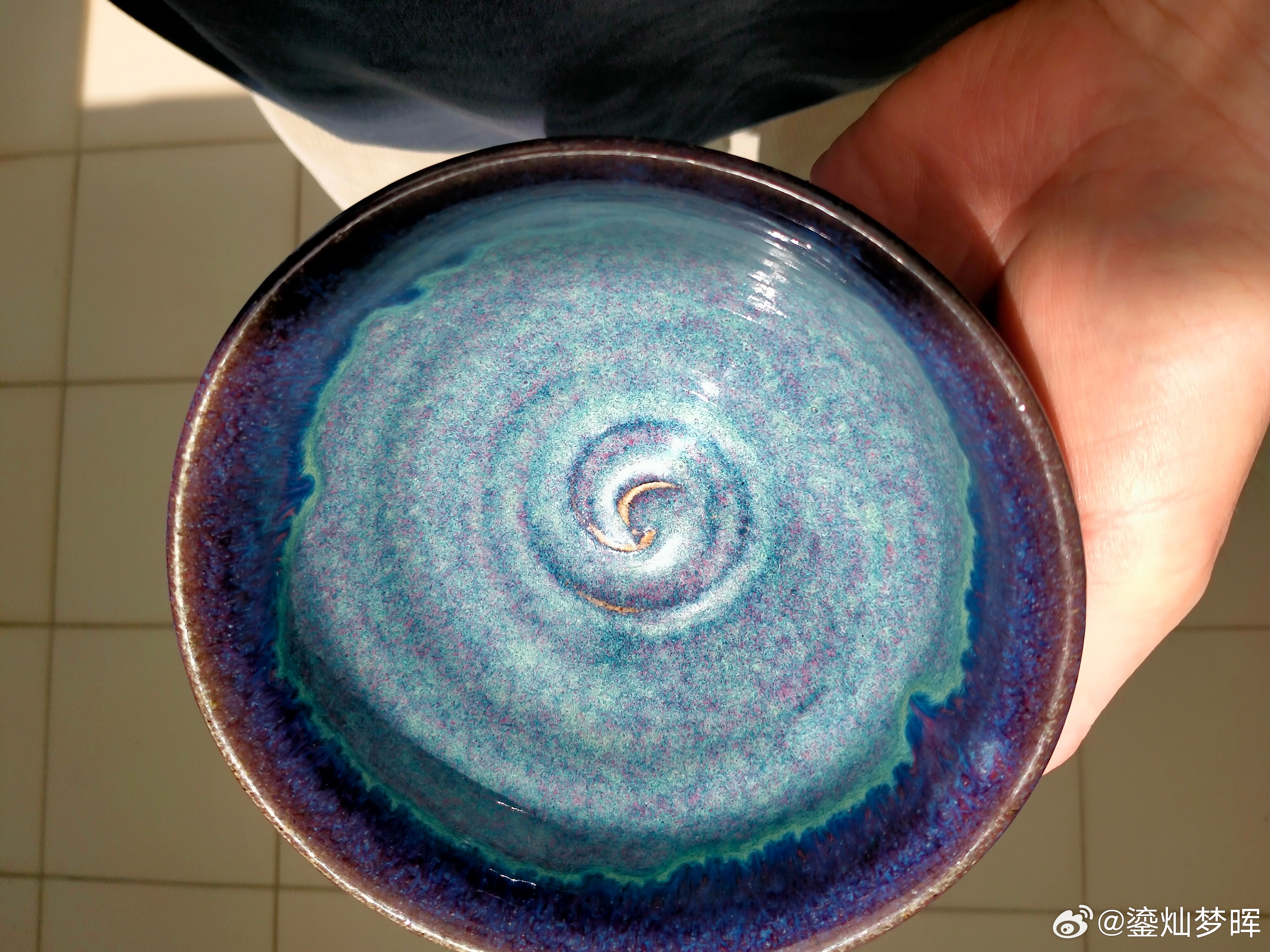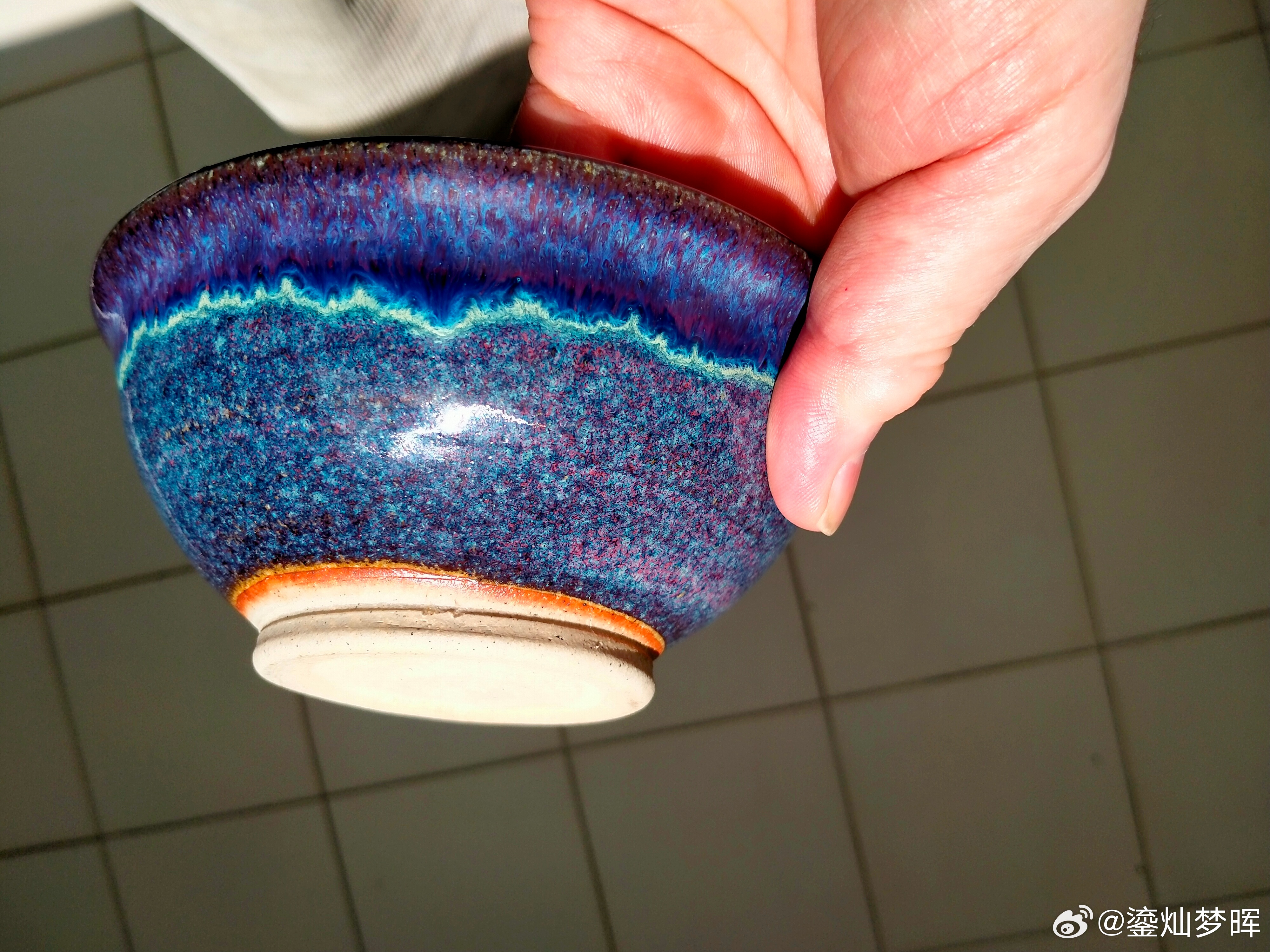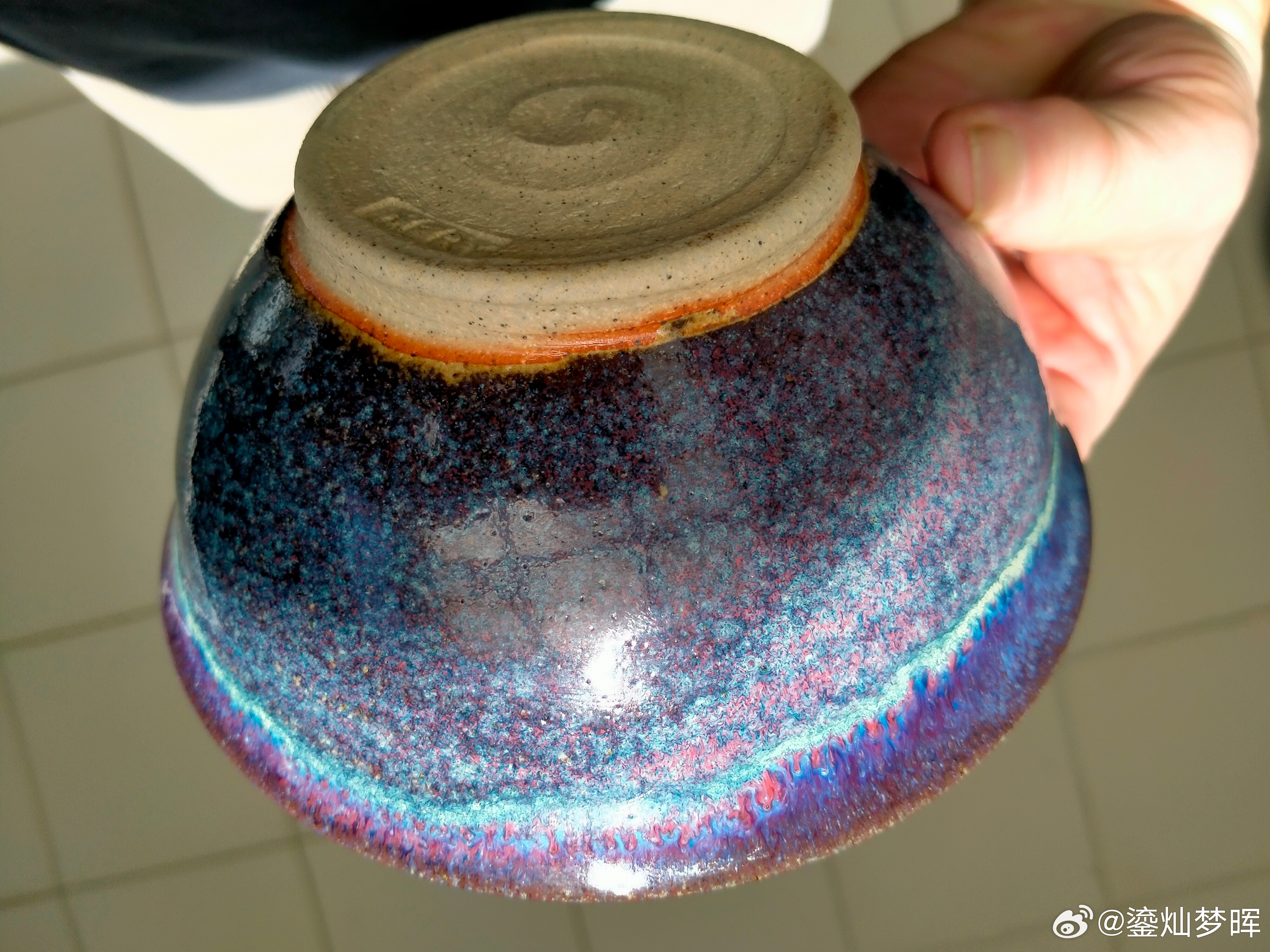 每周鉴赏收藏精品之北宋钧窑窑变釉碗 这是一个非常标准的北宋钧窑窑变釉瓷器,乳浊釉,窑变釉色彩斑斓艳丽。 从底足的处理看,应该是北宋中期左右的。基本上是平底,没有施釉,还有芝麻酱胎的特征。是官窑还是民窑钧瓷不好说。因为,碗心的两条小弧形,可以理解为是写意的鱼形。如果是这样的话,可能就是钧官窑的,至少也是定制瓷器。 从釉面的釉色和窑变效果看,应该是北宋时期的钧窑。窑变自然,釉料交融,整体效果浑然天成。是金元明三代钧窑达不到的境界。 底足上有一个冲压的英文人名符号,估计是某个外国藏家,知道本件钧窑碗的传承,认为是件很好的藏品,所以才用生硬的模具,冲压上自己的名号。这是西方藏家惯用的一种手法。 这种手法,可以说明两个问题,一是这件藏品是真东西和好东西,值得收藏;二是藏家自认为还是有点名气,打上简单的名号,一定范围内的人是知道是谁的。 之所以说这个角度的话题,不仅仅是说明本件北宋钧窑窑变釉碗是到代的真品,还会在下一篇中说到它的影响和后果。 总之,这是一个非常漂亮的北宋钧窑窑变釉碗。