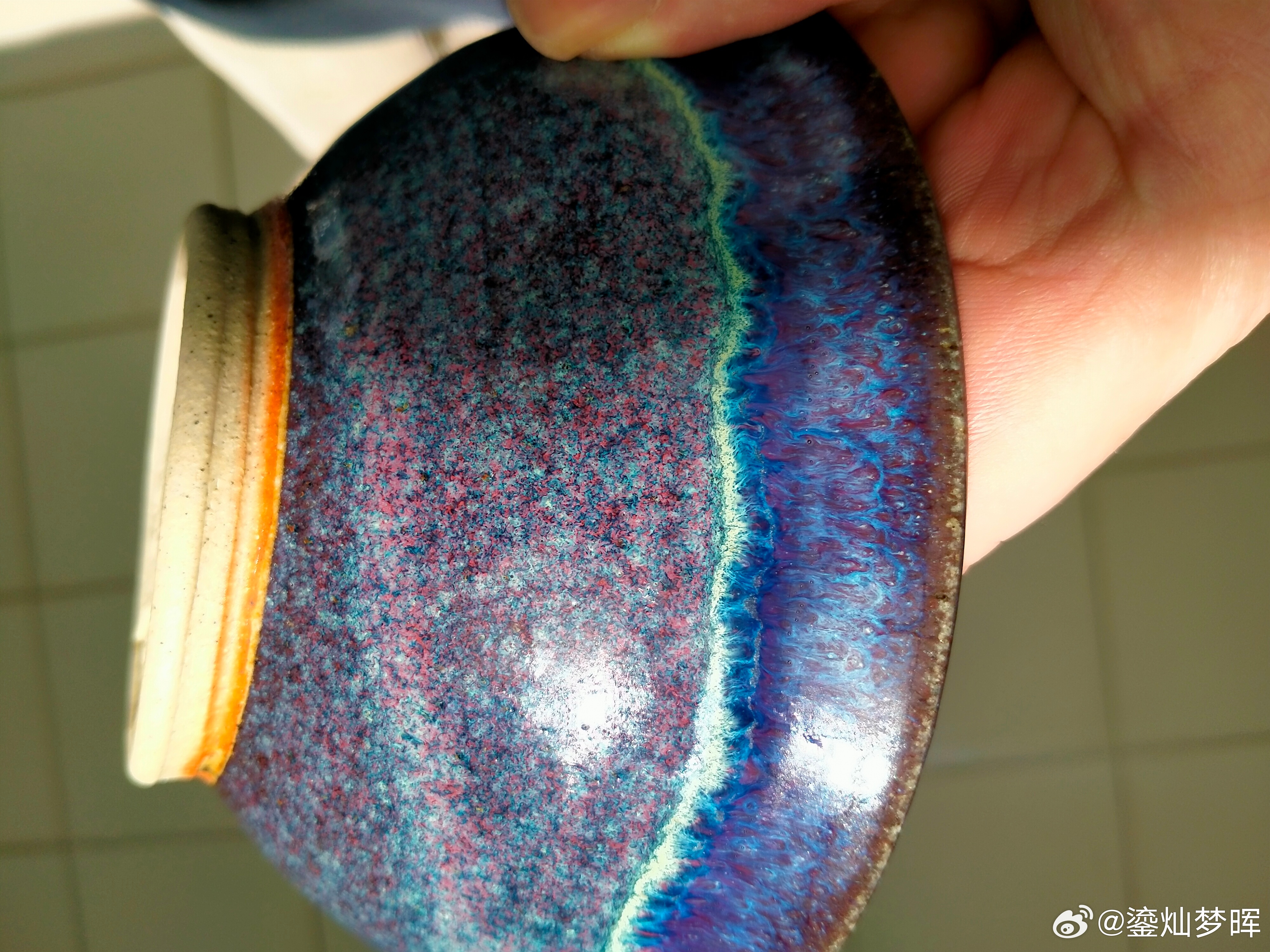 每周鉴赏收藏精品之北宋钧窑窑变釉碗 本件北宋钧窑窑变釉碗最大的优点,就是窑变釉色漂亮。 从釉色种类上来说,红、紫、蓝、绿四色交融。北宋钧窑同一个瓷器上能够出这四色窑变,应该非常稀少。特别是本件窑变釉,似乎已经有人为干预的迹象:碗内面的蓝色窑变界限,和碗外壁的绕壁一圈的蓝色釉线,如果是纯粹的自然窑变,那也太神奇了吧?所以,估计有窑工施釉技巧在里面。 似乎是窑工希望窑变出两个色域的区域,内膛以蓝色区域为主,可以理解为海洋,这样,那两个不施釉的小曲线,就是代表畅游在海洋中的大鱼。碗外壁以蓝色线为界,上天下地。古董鉴赏就是这样,我们不知道窑工当时的想法,但可以根据状态进行合理的解释,甚至随意想象。 有的时候就想,这个碗是内膛的蓝好看,还是碗壁的紫红好看?发现明代藏家很高明,把钧窑颜色划为一红二绿三蓝紫,真是划难为简!可我们曾经确实想分出哪个面更漂亮。自寻烦恼。 本件北宋钧窑窑变釉碗,虽然是民窑的实用器,估计后世也没有人舍得实际用它喝茶吃饭。 总之,本件北宋钧窑窑变釉碗,真是一个漂亮的瓷器,中外共赏。