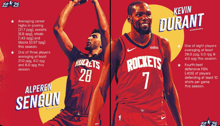 虎扑01月15日讯今日,火箭官方更新动态,晒出一组海报为申京和KD入选全明星拉票。