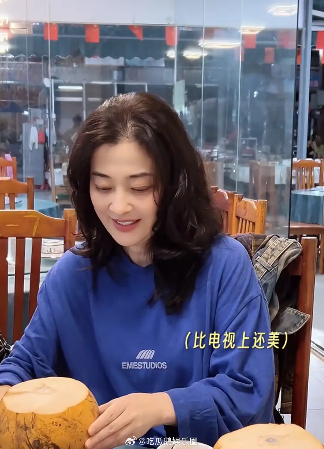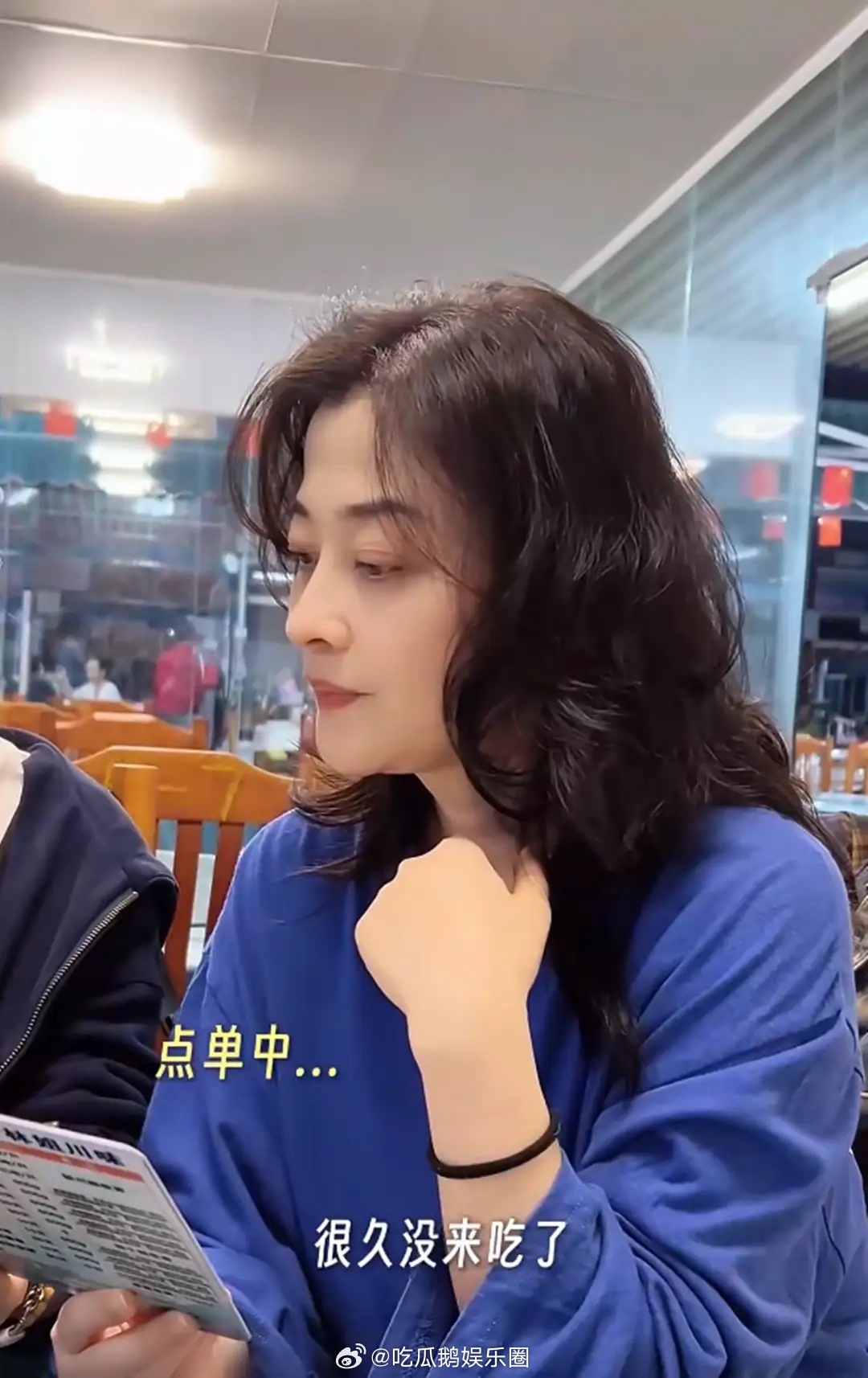梅婷吃海鲜大排档,50了脸蛋很紧致,没做发型头顶稀疏发缝好宽!
