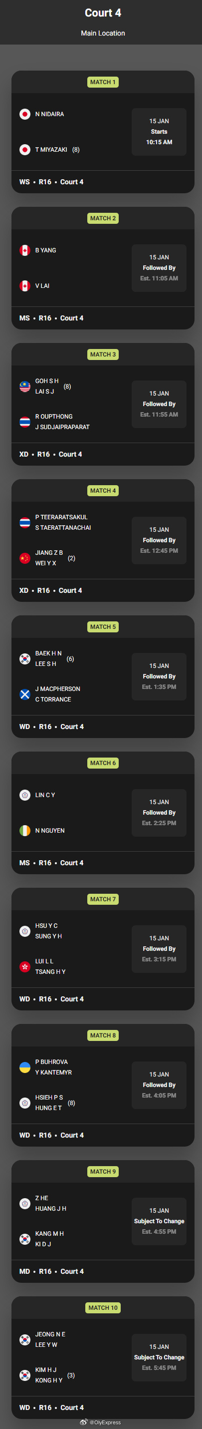 【印度羽毛球赛次轮赛程对阵】2026年印度羽毛球公开赛羽联超级赛1月15日新德里,2026世界羽联超级750印度公开赛将进行第二轮。比赛将于北京时间12:30开始,国羽赛程对阵如下,完全赛程对阵见图:男单:陆光祖vs昆拉武特(泰国)女单:韩悦vs班索德(印度)陈雨菲vs布桑南(泰国)王祉怡vs阮翠灵(越南)男双:梁伟铿/王昶vs阿姆萨卡鲁南/阿俊(印度)黄荻/任翔宇vs刘广珩/杨博涵(中国台北)女双:刘圣书/谭宁vs五十岚有纱/志田千阳(日本)李怡婧/罗徐敏vs乔利/普莱拉(印度)混双:冯彦哲/黄东萍vs黄显维/赖沛君(马来西亚)蒋振邦/魏雅欣vs特拉拉特萨库尔/沙西丽(泰国)程星/张驰vs克里斯蒂安森/博耶(丹麦)郭新娃/陈芳卉vs塞德尔/阮淑芳(德国)