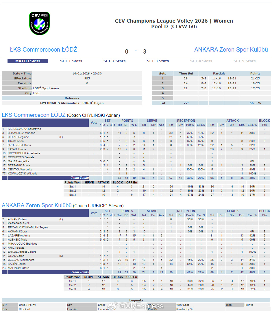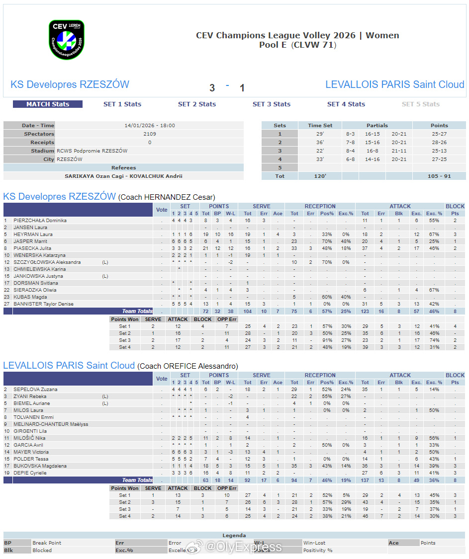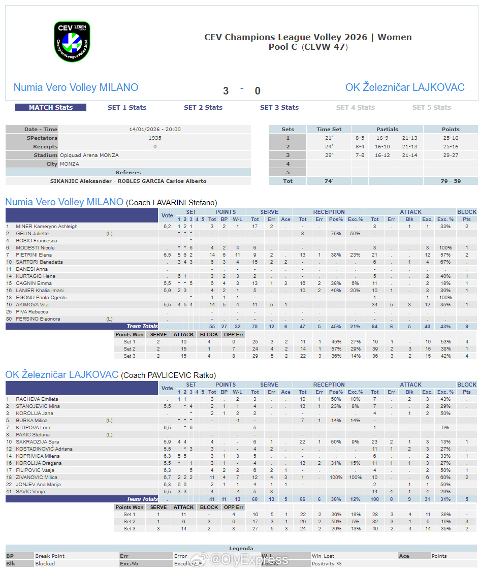 【欧冠女排米兰零封铁路工人 泽伦3-0罗兹LKS】国际排坛战报速递 1月14日,欧冠女排第四轮第四回合,C组意大利米兰主场3-0(25-16/25-16/29-27)零封塞尔维亚铁路工人,3胜1负10分排名小组第一。MVP阿基莫娃和皮耶特里尼各14分、埃格努替补1分,客队奇瓦诺维奇11分。D组土耳其泽伦竞技客场3-0(25-21/25-18/25-17)完胜波兰罗兹LKS,乌泽拉奇20分、MVP拉扎列娃17分、S-沙辛12分,布拉姆比拉11分、菲亚德10分。E组波兰热舒夫主场3-1(25-27/28-26/25-13/27-25)力克法国巴黎,皮亚塞卡21分、MVP海尔曼19分、班尼斯特13分,布科夫斯卡18分、德皮耶16分、米洛西奇11分。
