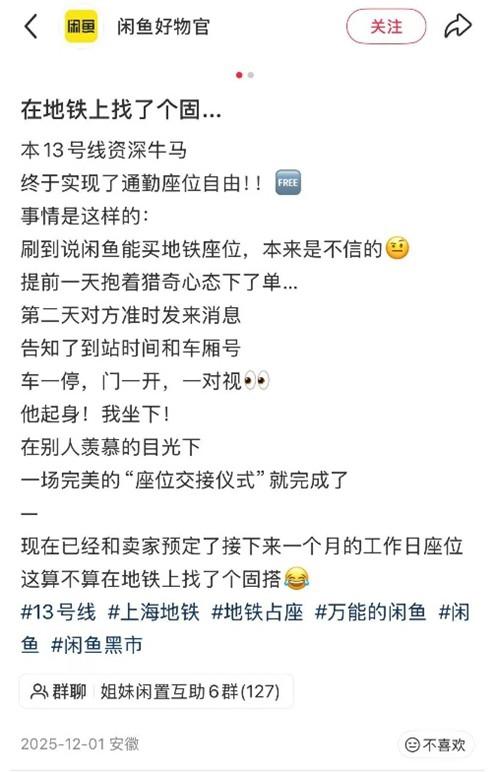 记者注意到,虽然闲鱼平台上已检索不到相关商品,但在小红书等社交平台,围绕“有偿代坐”的内容仍在流通。其中不乏带有官方认证标识的账号发布体验帖,用轻松甚至略带炫耀的口吻,讲述提前下单、到站对接、顺利入座的全过程,调侃“在地铁上找了个固搭”。