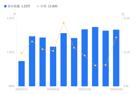 日期A股户数(户)流通A股户均持股数(股)户均持股市值(万元)2026-01-091217419606.2023.172025-12-191210019726.1121.072025-12-101237019295.5420.572025-11-101219919566.0221.662025-10-201155820651.1423.522025-09-301191520032.3924.882025-09-101092121855.6824.612025-08-201159420587.0223.332025-08-081168520426.6923.802025-07-31986224202.5827.03