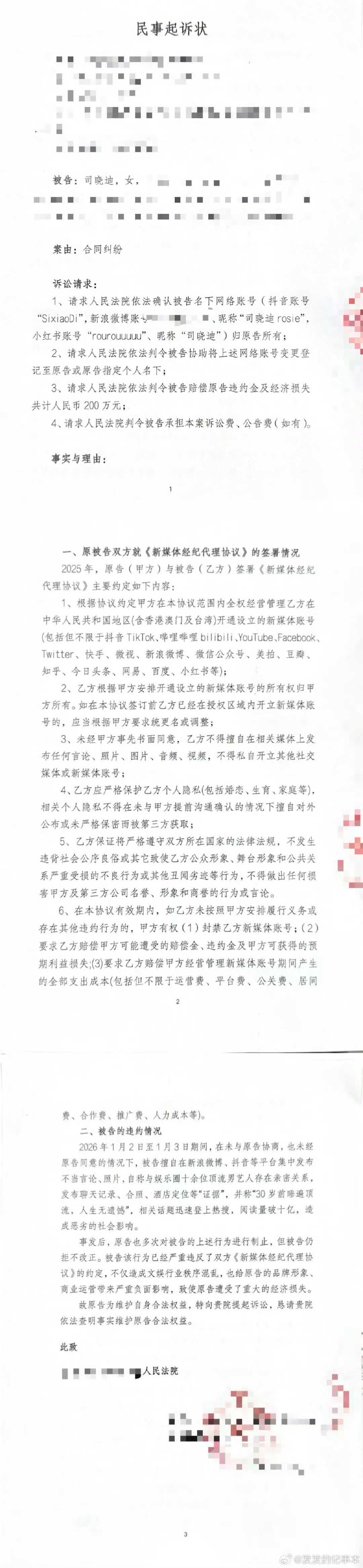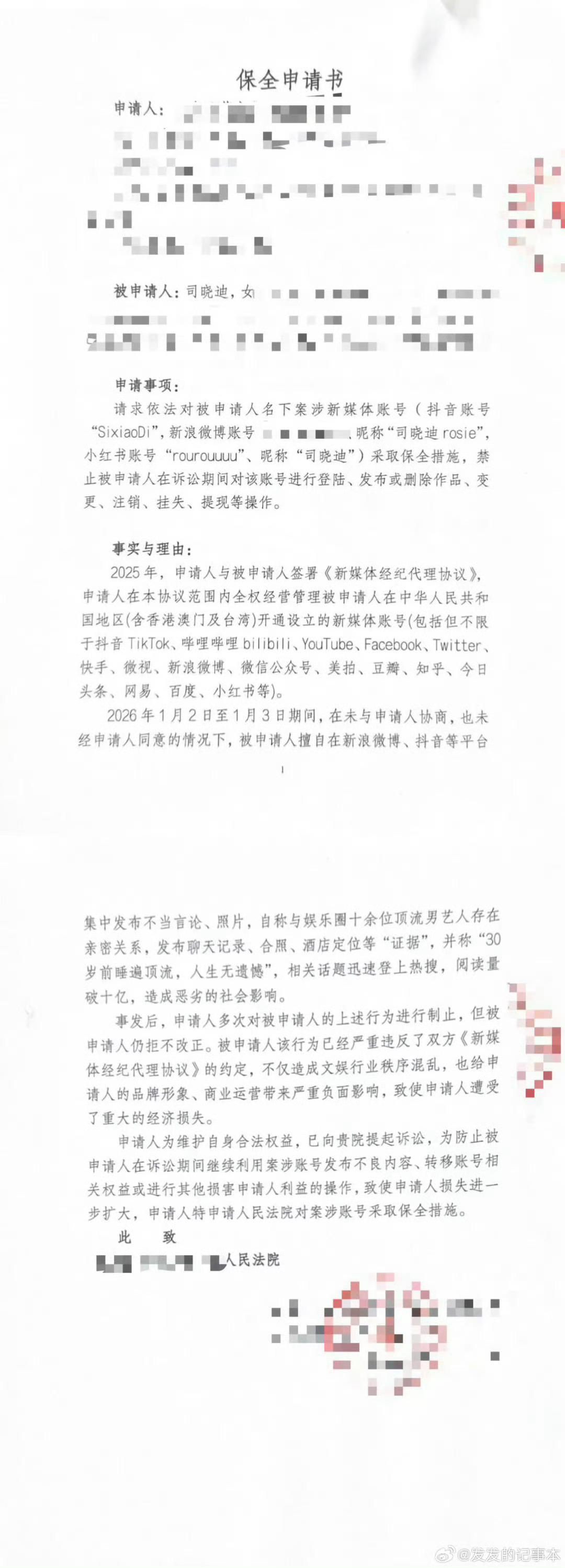 王大发起诉司晓迪原来王大发是司晓迪的老板,她半夜发文代表司晓迪的媒体经纪公司向大众道歉。