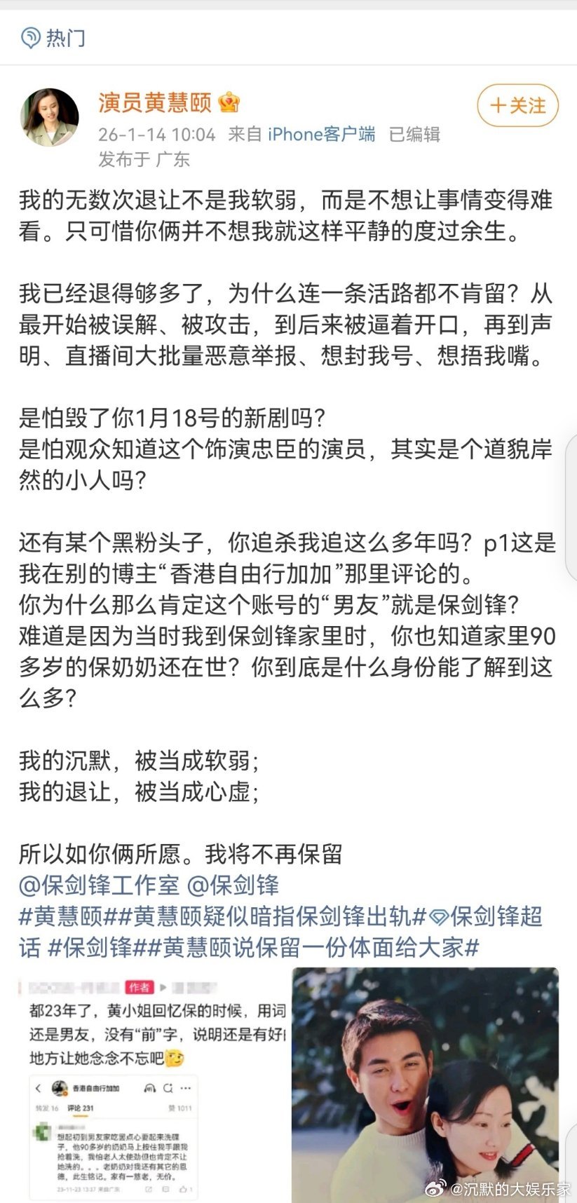 黄慧颐说保剑锋婚前出轨,俩人在2001年8月28日登.记结婚, 没有任何仪式,没有婚纱,更没有婚礼。当时的她很瘦,是因为他婚前出轨了一次。本来已经放下过去,结果保剑锋多年来对她一直“穷追猛打”,还买了好多水军攻.击黄女士,不给留一条活路。黄慧颐曾为了保剑锋放弃广东事业赴上海助其走红,但2007年两人分手,黄慧颐质疑2006年两人没分手时保剑锋出轨他人,去年12月,保剑锋工作室严正辟谣,否认出轨。现在看男方的回应,更相信女方没有编故事了~黄慧颐说保剑锋婚前出轨