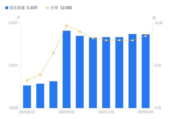 日期A股户数(户)流通A股户均持股数(股)户均持股市值(万元)2026-01-095336412918.5817.522025-12-315358312865.7816.402025-11-305172913326.9017.032025-11-285172913326.9017.032025-11-205145713397.3417.602025-11-105252013126.1818.902025-09-305553412413.7919.292025-06-302575226557.9227.542025-03-312432029732.0918.672025-02-102328031060.3316.21