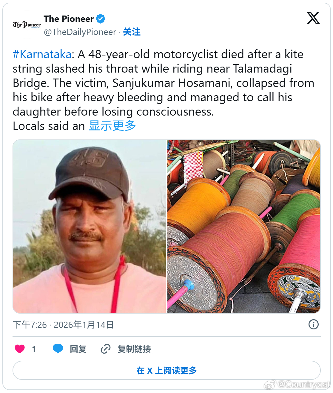 风筝节酿悲剧!印度两名男子骑车遭风筝线割喉身亡海外新鲜事 每年1月14日举行的风筝节是印度的重要传统节庆之一,但今年节日期间却接连发生致命事故。近日已有两名男子在骑车途中被横跨道路的风筝线割伤颈部,当场或送医后不治身亡,引发社会对风筝线安全隐患的广泛关注。据《每日邮报》报道,48岁的摩托车骑士桑朱库马尔·霍萨马尼(Sanjukumar Hosamani)在行经印度比达尔地区时,意外撞上横跨道路、绷紧的风筝线,锋利的线材直接割伤颈部,导致其大量失血倒地。霍萨马尼从摩托车上跌落后,仍勉强拨打电话联系女儿,但随后很快失去意识。现场有路人尝试为其止血并报警求助,但救护人员赶到时,他已被宣告死亡。家属事后指控,救援单位反应迟缓,间接导致悲剧发生。另一起致命事故发生在印多尔市。45岁的瓷砖承包商拉古维尔·达卡德(Raghuveer Dhakad)在下班返家途中,同样被风筝线割伤喉部,紧急送医抢救后仍因伤势过重不治。警方调查发现,造成致命伤害的风筝线为已被政府明令禁止的尼龙材质风筝线,再度引发外界对违规线材流通问题的质疑。每年1月14日是印度传统节日“风筝节”,也是庆祝丰收的重要日子。节日期间,许多民众会登上屋顶放风筝,天空中五彩斑斓、风筝密布,成为当地独特的节庆景象。然而,风筝节上盛行的“斗筝”活动也暗藏危险。为增强风筝线的强度和锋利度、以割断他人风筝,一些人会使用被称为“Manja线”的线材。这类线通常涂有玻璃纤维,极具杀伤力。早在2016年,一名儿童因颈部被Manja线缠绕致死后,印度政府已全面禁止该类线材,但相关事故至今仍时有发生。图:风筝节是印度的传统节庆,不过在今年风筝节期间,已经发生2起风筝线割喉意外。 (撷取自法新社)