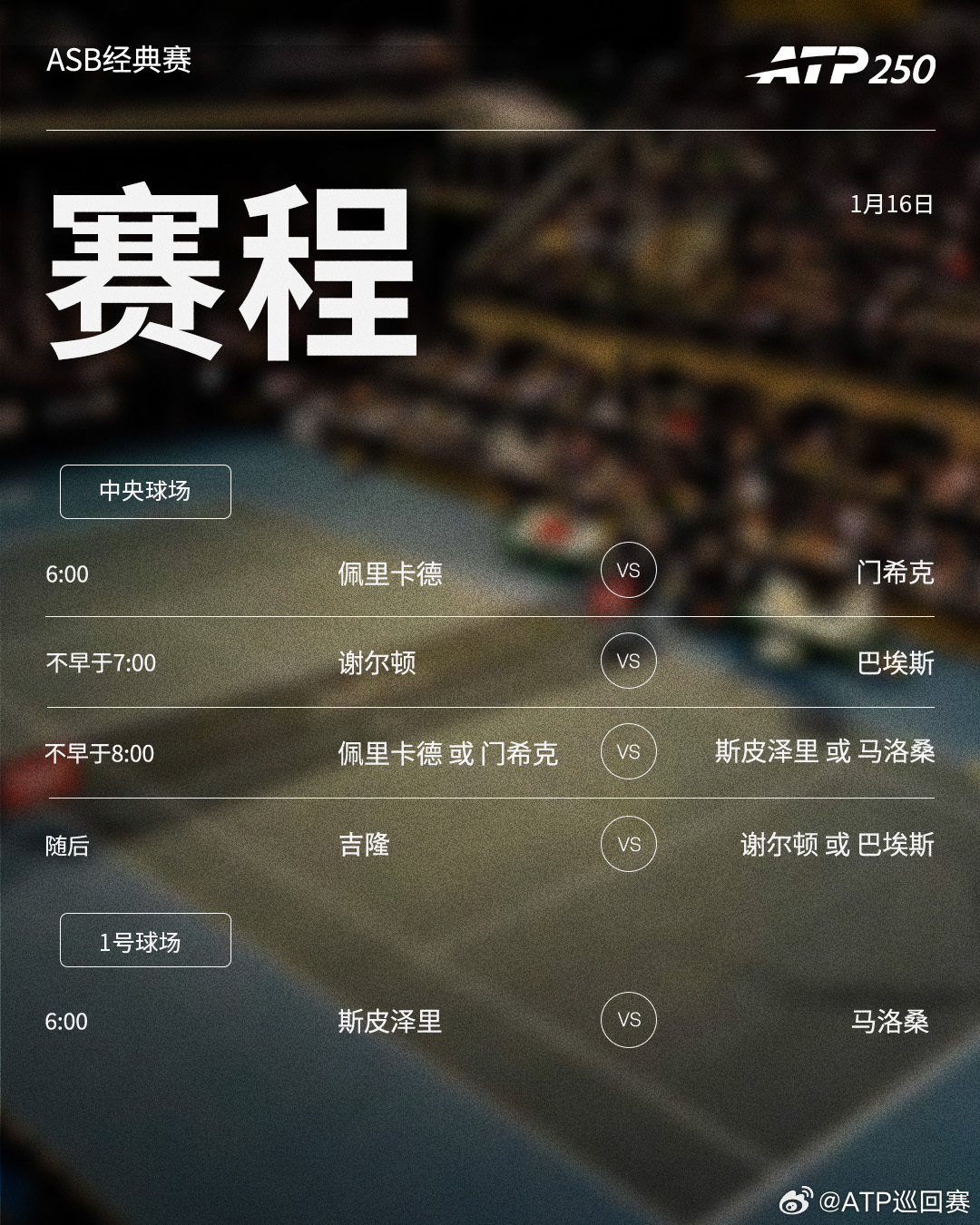 两项ATP250 赛事周五将展开半决赛的争夺,赛程见图(均为北京时间)📅 ⭕️ 阿德莱德网球国际赛📍澳大利亚·阿德莱德🎾达维多维奇·弗基纳、保罗冲击决赛⭕️ ASB精英赛 📍新西兰·奥克兰🎾 先进行三场1/4决赛补赛,胜者将一日双赛,谢尔顿、门希克出战网来不息ATP
