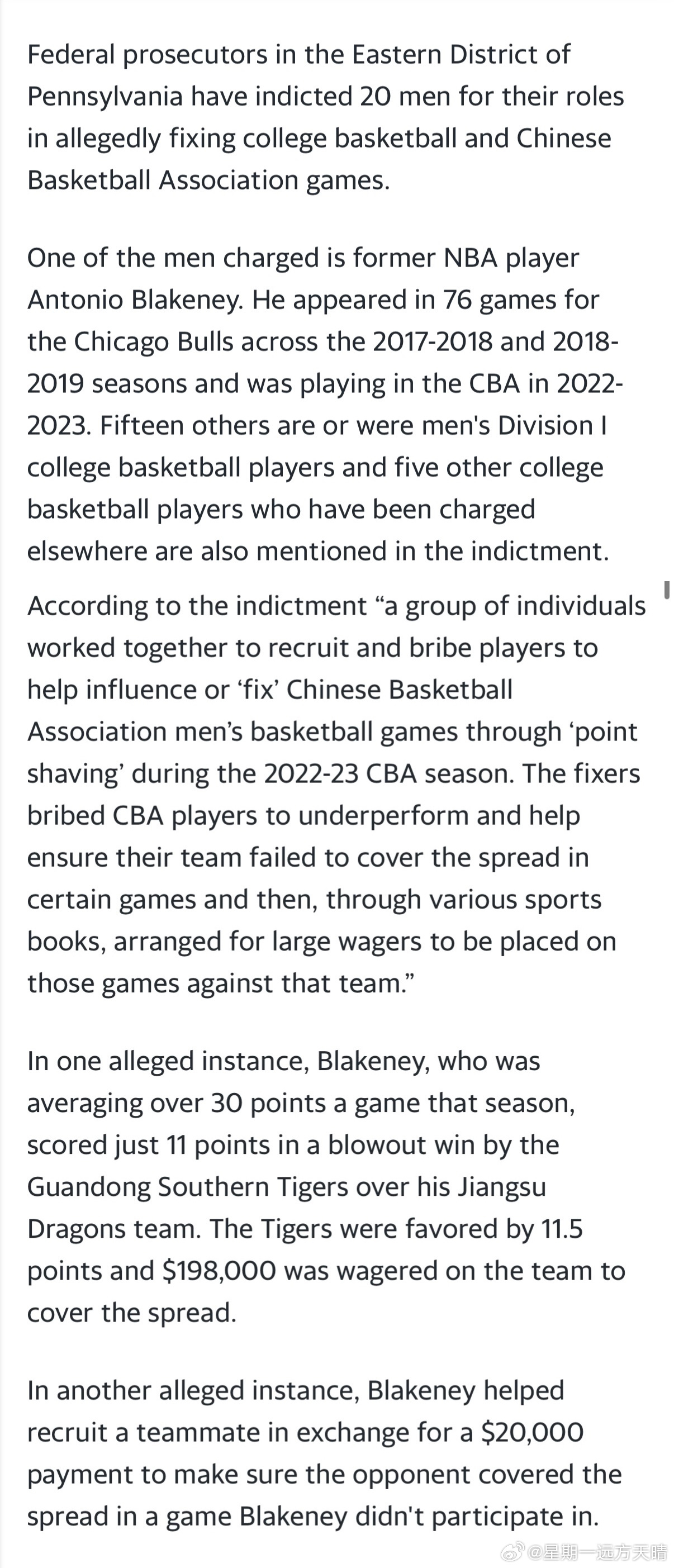 CBA联赛 【布莱克尼在江苏广东比赛中打假球】美国宾夕法尼亚州东区的联邦检察官已起诉 20 名男子,指控他们涉嫌操纵美国大学篮球比赛以及【中国男子篮球职业联赛(CBA)】的比赛结果。被指控人员之一是前 NBA 球员【安东尼奥·布莱克尼(Antonio Blakeney)】。他曾在 2017–2018 赛季和 2018–2019 赛季为芝加哥公牛队出战 76 场比赛,并在 2022–2023 赛季效力于 CBA。另外还有 15 人是现役或前 NCAA 一级联盟(Division I)的男子大学篮球球员,此外,还有 5 名此前已在其他案件中被起诉的大学篮球球员也在本次起诉书中被提及。根据起诉书内容,“一群人相互勾结,通过招募并贿赂球员,影响或‘操纵’中国男子篮球职业联赛CBA的比赛结果,具体方式是在 2022–2023 赛季进行所谓的 ‘削分(point shaving)’。这些操盘者向 CBA 球员行贿,要求他们在比赛中刻意表现失常,从而确保球队无法达到博彩公司设定的让分盘口。随后,他们通过多家体育博彩公司,在这些比赛中对该球队的对手下注巨额赌金。”【江苏对阵广东】在其中一起被指控的案例中,布莱克尼当赛季场均得分 30 分以上,但在一场比赛中,他所在的 江苏龙队以大比分输给 广东华南虎队,而布莱克尼仅得到 11 分。该场比赛中,广东队让分为 11.5 分,共有 19.8 万美元被下注在广东队能够覆盖让分盘口。在另一项指控中,布莱克尼据称以 2 万美元的报酬,帮助招募一名队友,确保在一场 他本人并未出场的比赛中,对手能够成功赢下让分盘口。CBA