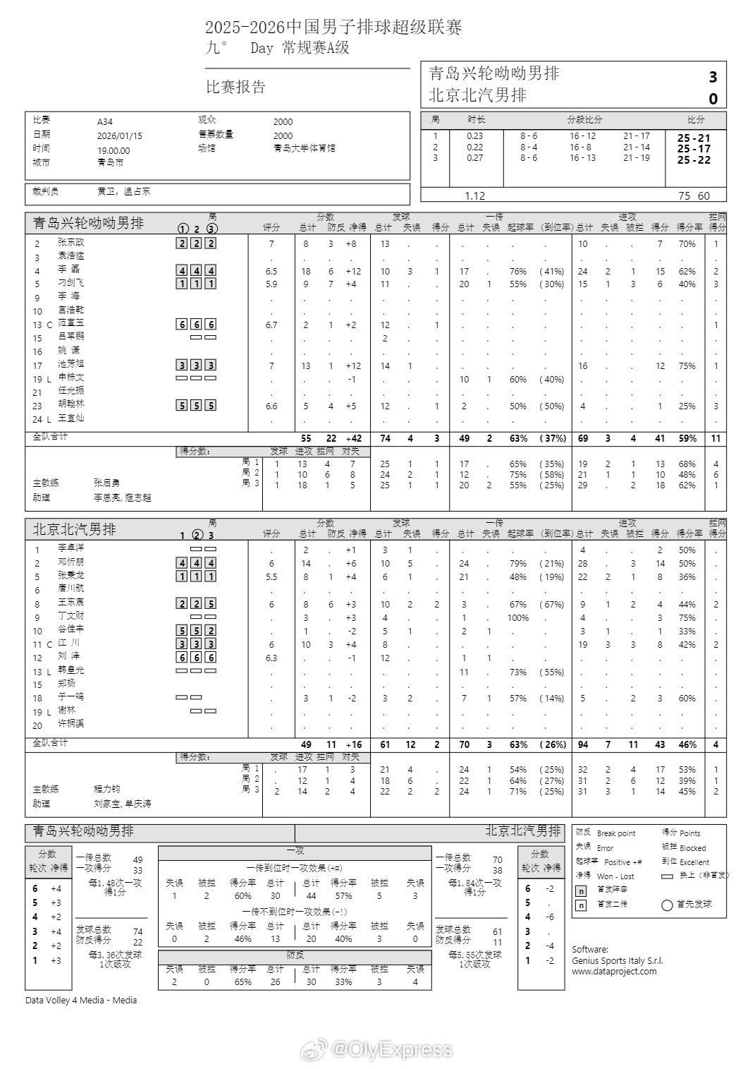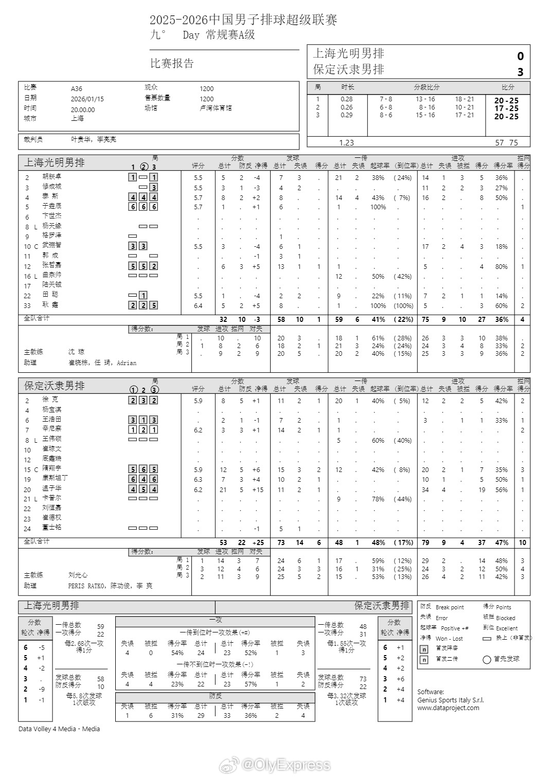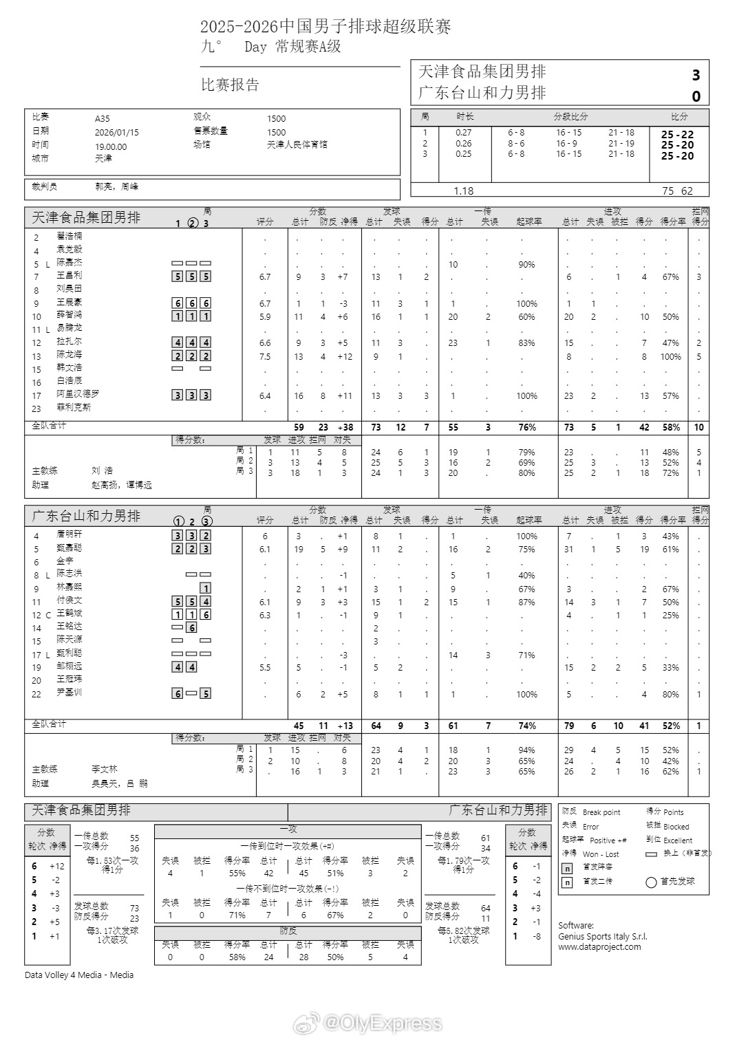 排超联赛 1月15日,男排联赛技术统计。