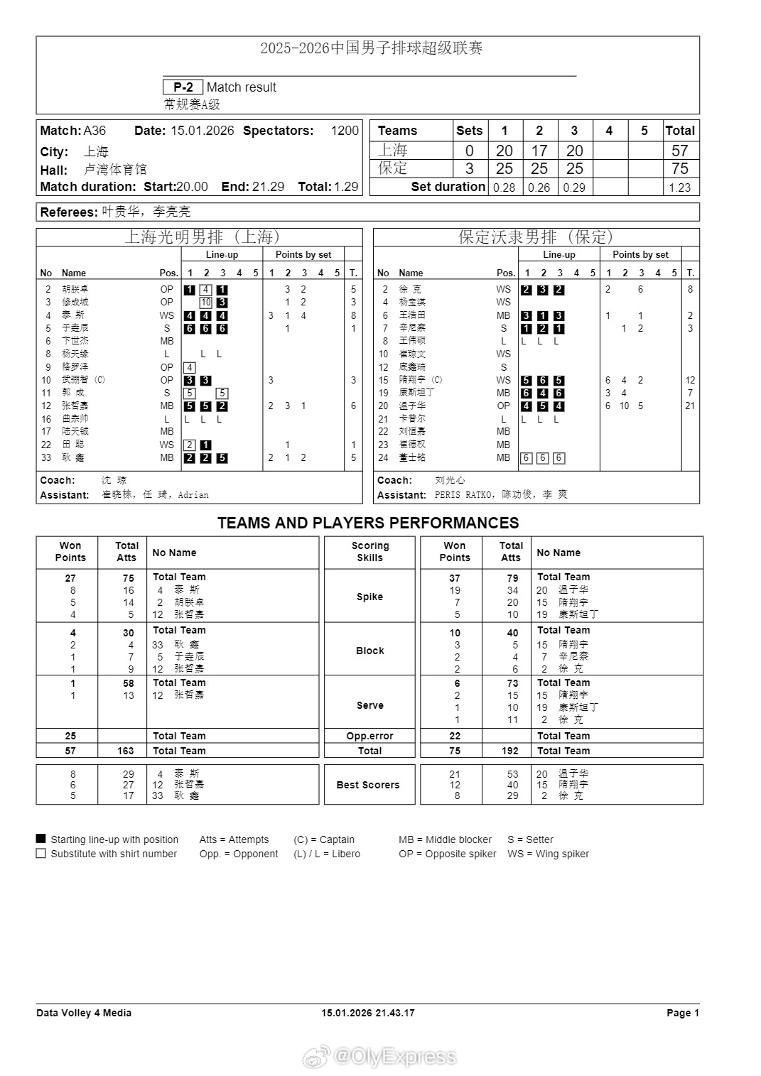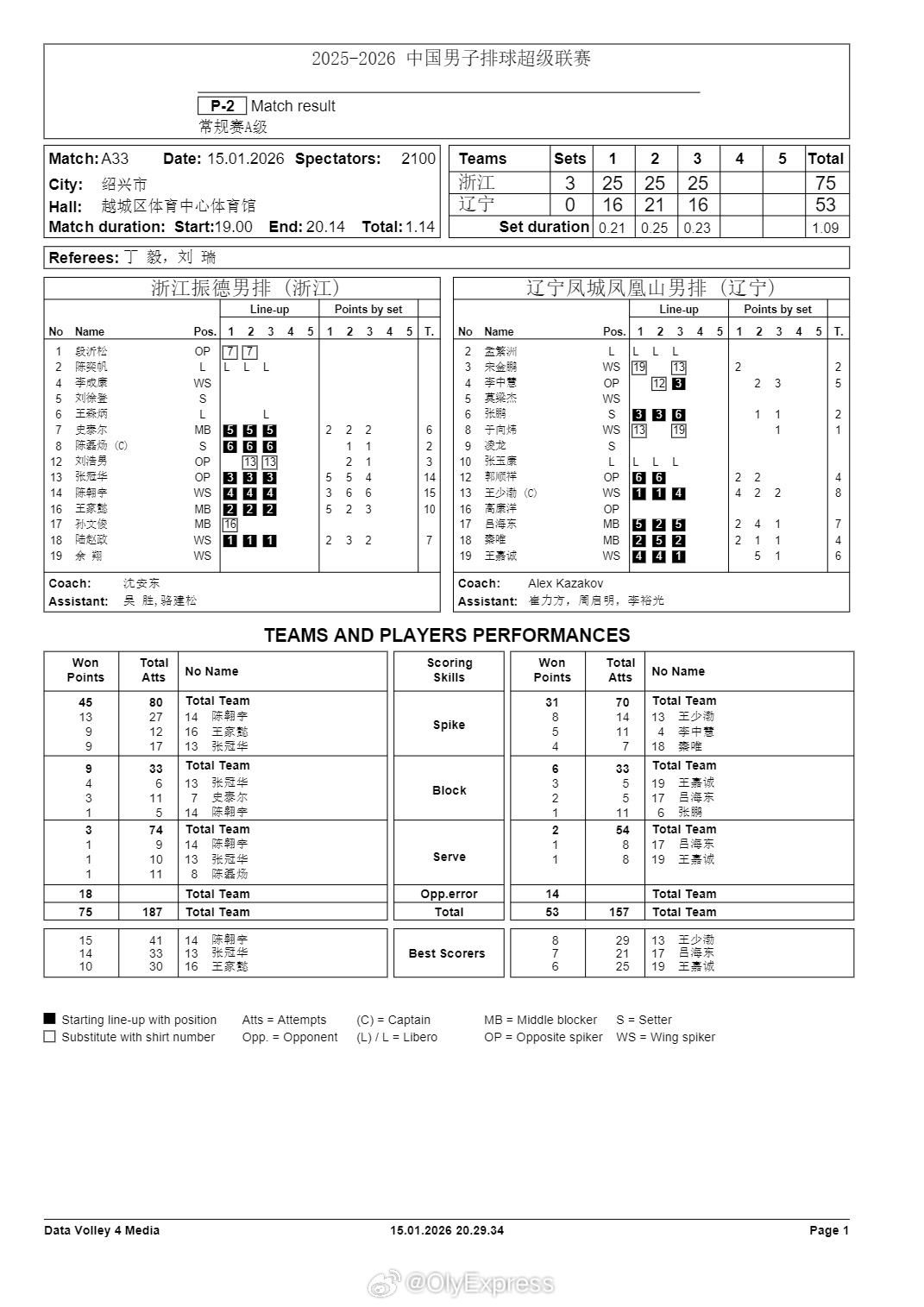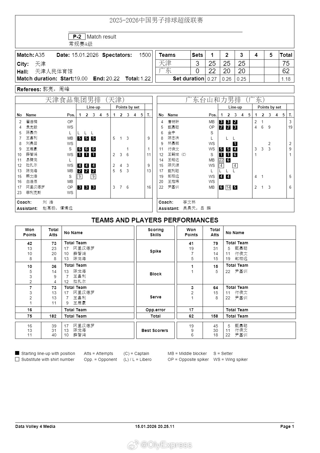 排超联赛 1月15日,男排联赛技术统计。