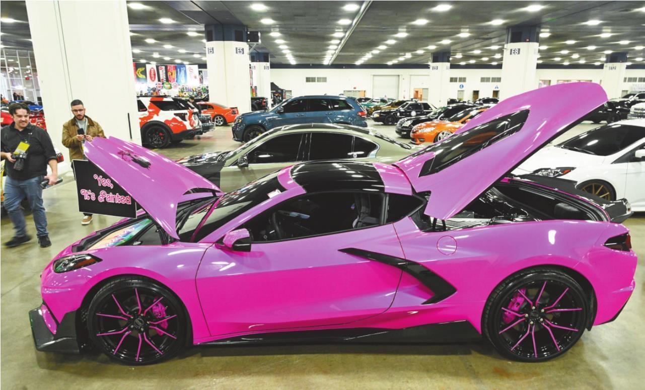 1月14日,人们在美国底特律车展的媒体开放日现场观看一辆粉色涂装汽车。美国底特律车展于1月14日至25日在“汽车之城”底特律举行。