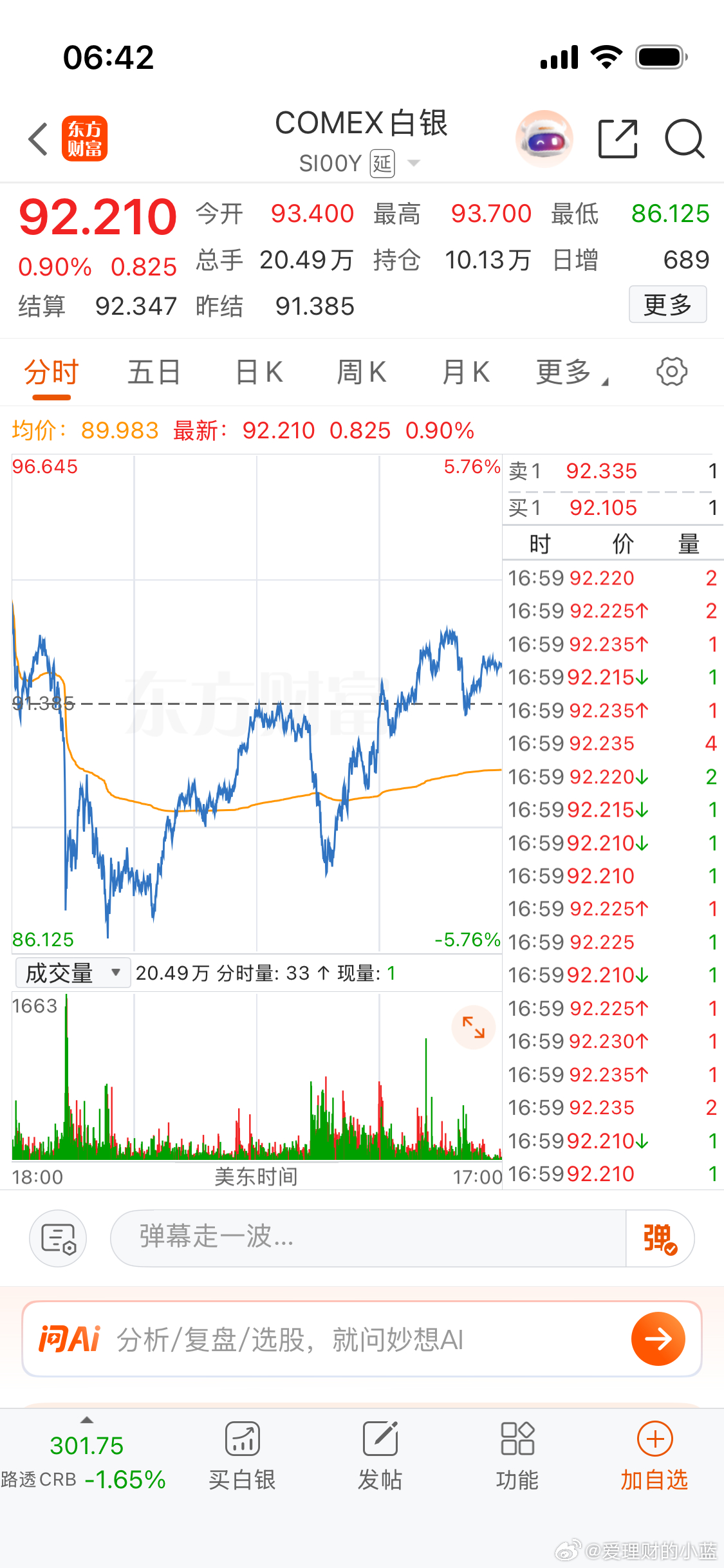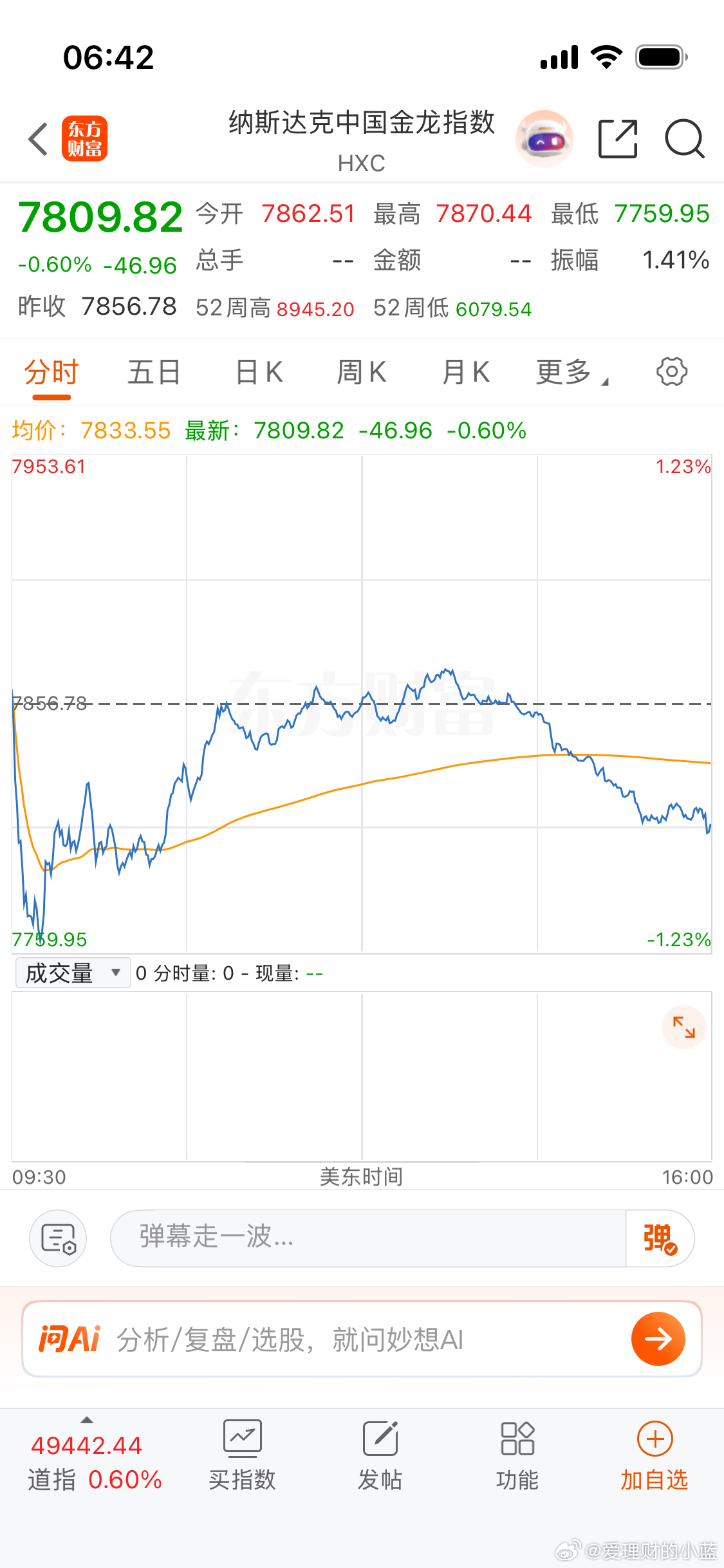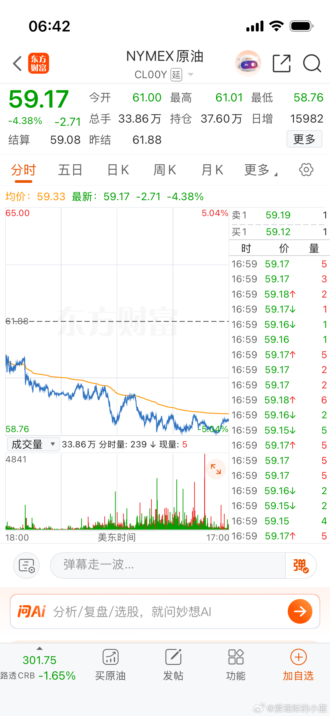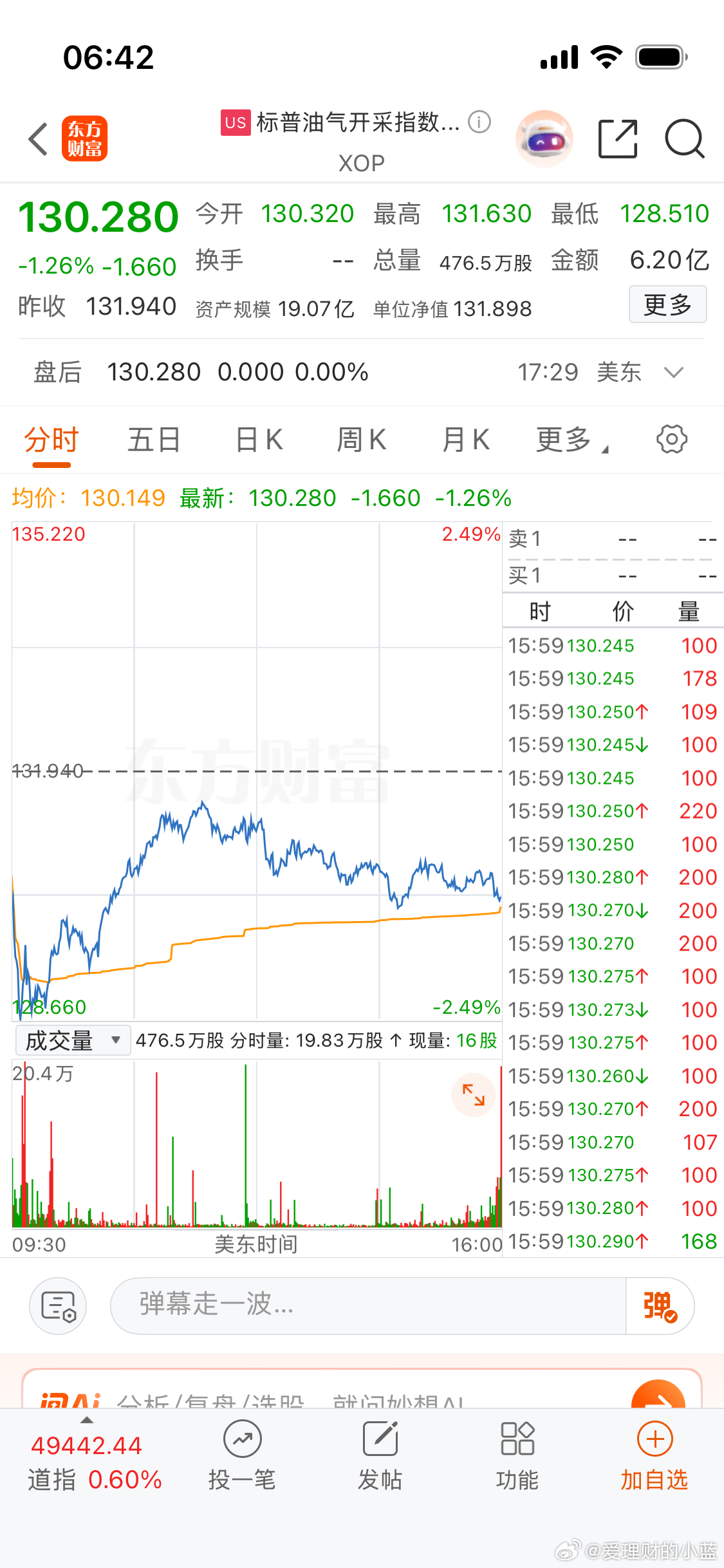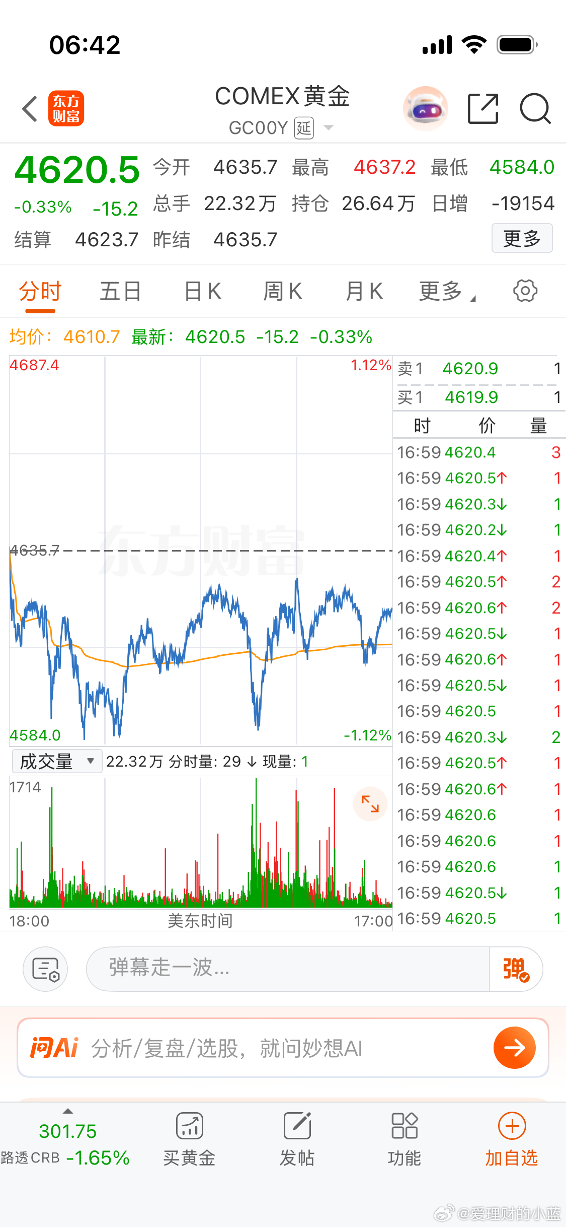 各位上市公司股东们早上好。美股尾盘跳水高开低走。纳斯达克 +0.25 纳斯达克100 +0.32生物科技 -1.40 金龙指数 -0.60黄金 -0.33 白银 +0.90原油 -4.38 油气 -1.26拜托大家不要只看不互动播报博主不好做。谢谢大家的支持。金价彻底杀疯了