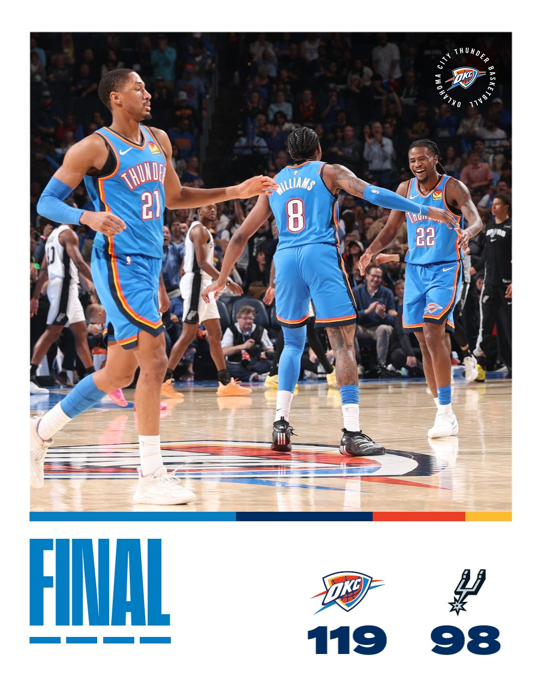 雷霆赛季首胜马刺任嘉伦预测nba总冠军 雷霆终结对马刺三连败,赛季首次击败马刺,119-98大胜21分!亚历山大赛后表示这场比赛不是超级碗,只是82场常规赛里的一场,平静看待,我们要做得就是证明自己,持续变好!