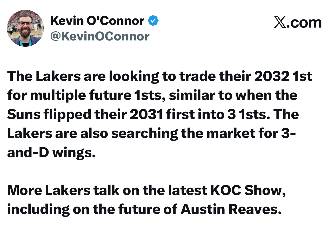 雅虎体育记者Kevin O'Connor在播客中透露,湖人正在寻求用他们2032年的首轮签换取多个未来首轮签,这和太阳此前将2031年首轮转化为三个首轮的操作方式类似。同时,正在市场上寻找3D侧翼的湖人计划打包文森特和范德比尔特用以交易来那样的球员。