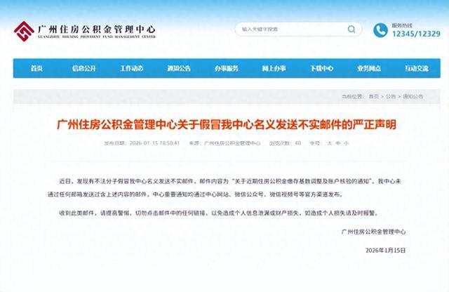 广州住房公积金管理中心15日发布声明称,近日,有不法分子假冒中心名义,发送不实邮件,邮件内容为“关于近期住房公积金缴存基数调整及账户核验的通知”。