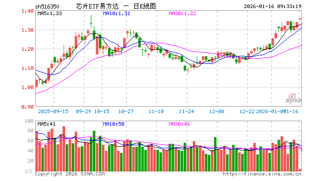 1月16日,芯片ETF易方达(516350)开盘涨1.20%,报1.351元。芯片ETF易方达(516350)重仓股方面,中芯国际开盘涨2.46%,寒武纪涨0.35%,海光信息涨1.08%,北方华创涨1.24%,澜起科技涨2.14%,兆易创新涨1.99%,中微公司涨1.62%,豪威集团涨0.82%,芯原股份跌0.25%,长电科技涨2.30%。