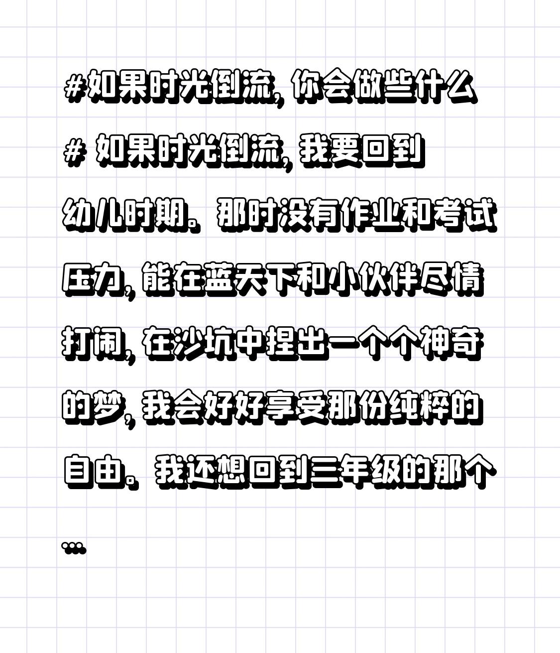 如果时光倒流,我要回到幼儿时期。那时没有作业和考试压力,能在蓝天下和小伙伴尽情打闹,在沙坑中捏出一个个神奇的梦,我会好好享受那份纯粹的自由。 我还想回到三年级的那个黄昏。看到同学欺负小狗,我不该被他的眼神吓住而逃走,我会冲上去推开他,保护那只可怜的小狗。 更想回到五年级期末考的前一夜,放下漫画书,认真复习语文。这样就不会在考场上大脑空白,与九十分失之交臂。可惜时光不会倒流,只能把握当下呀。