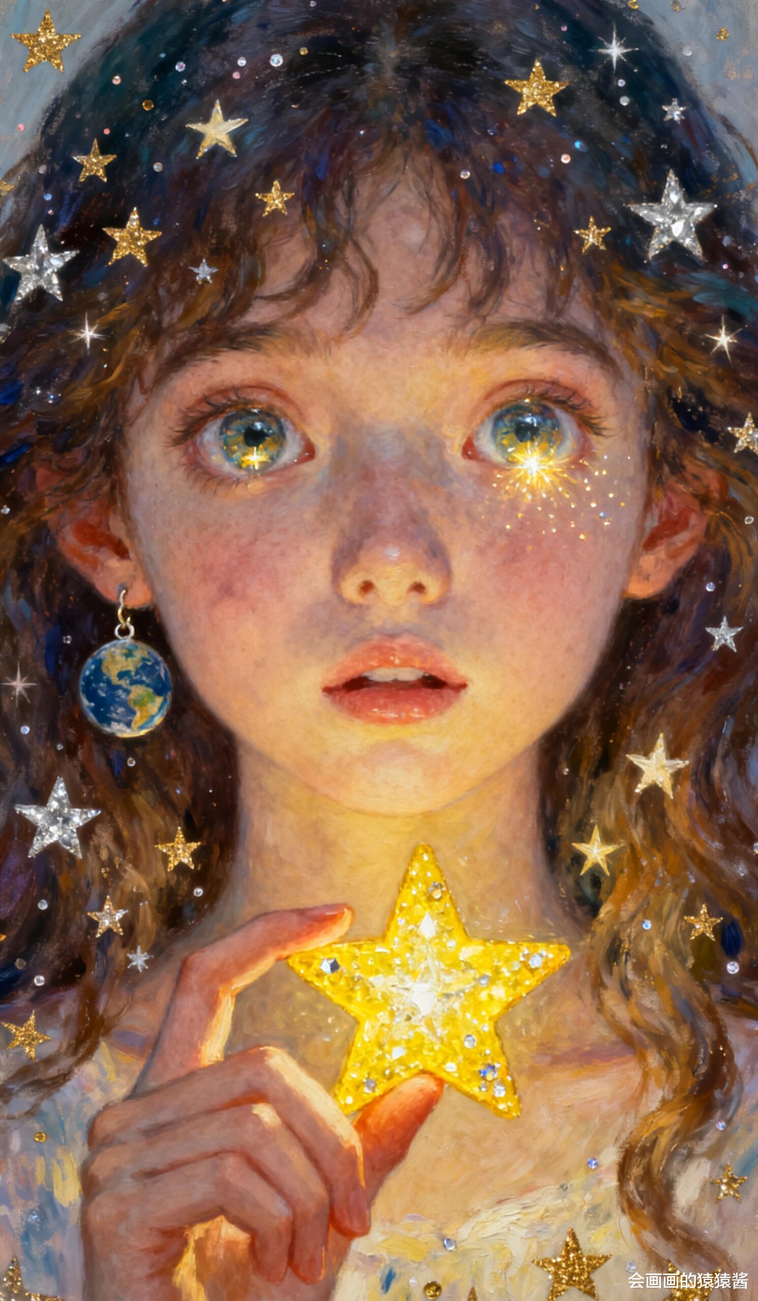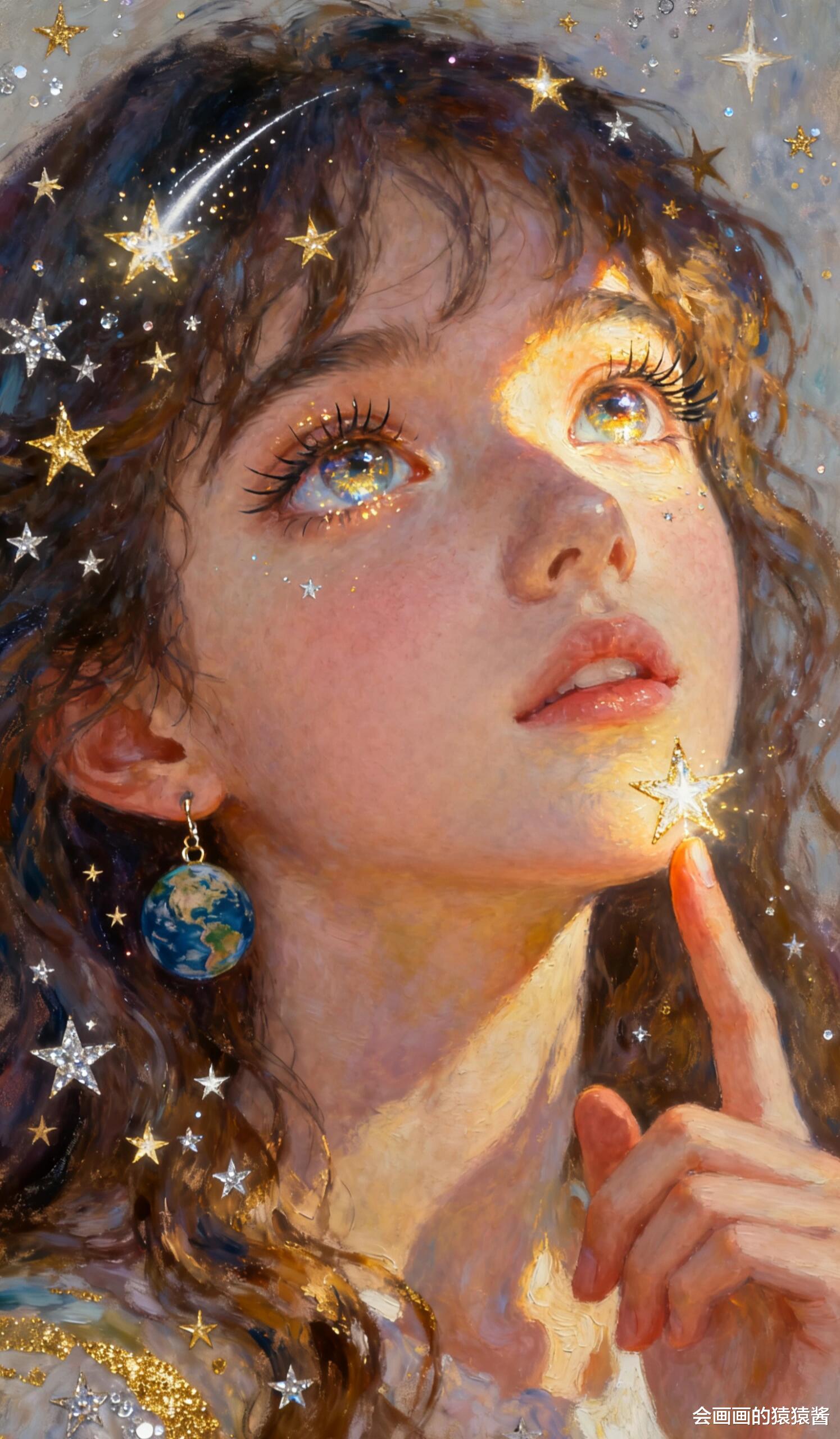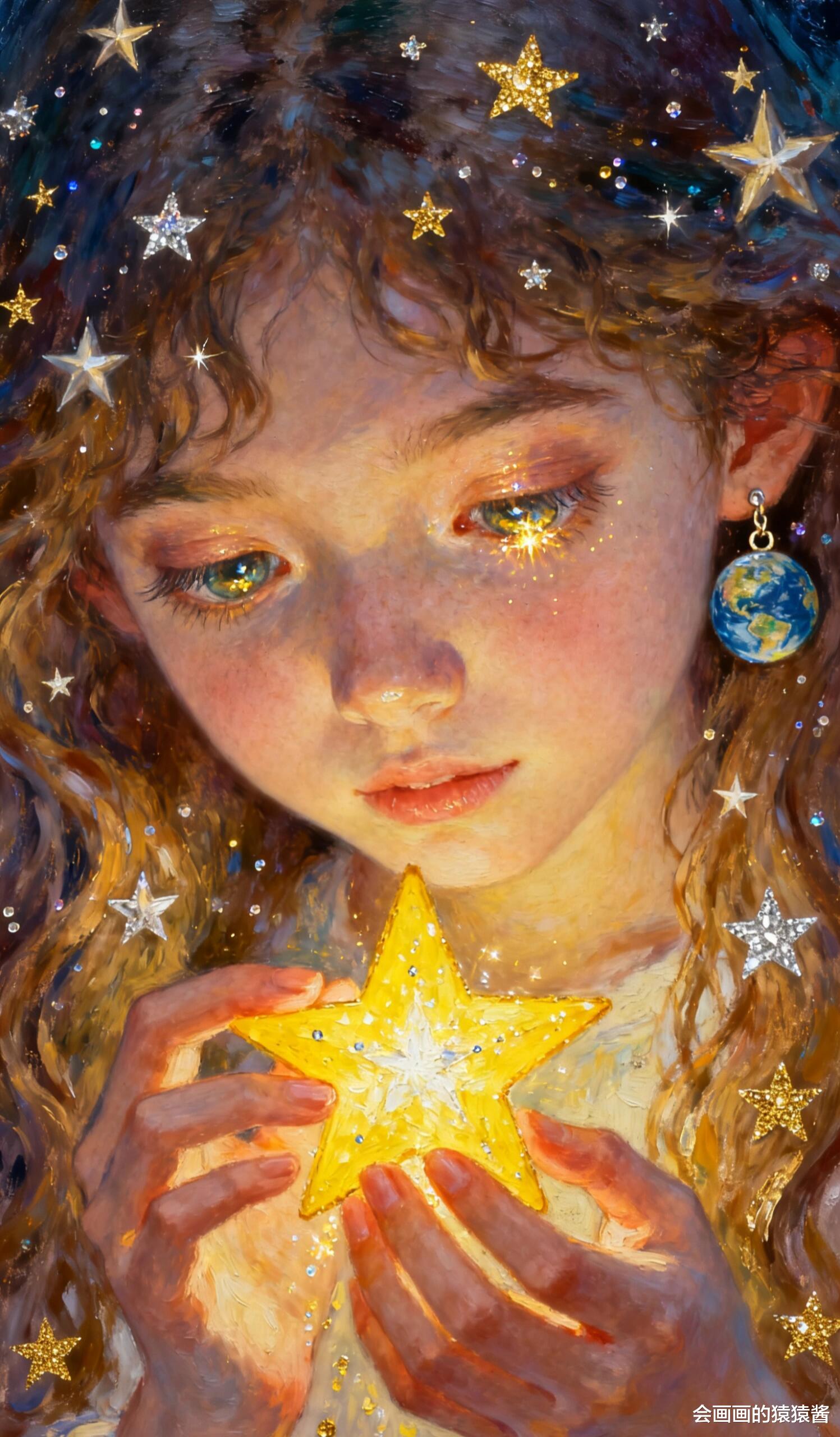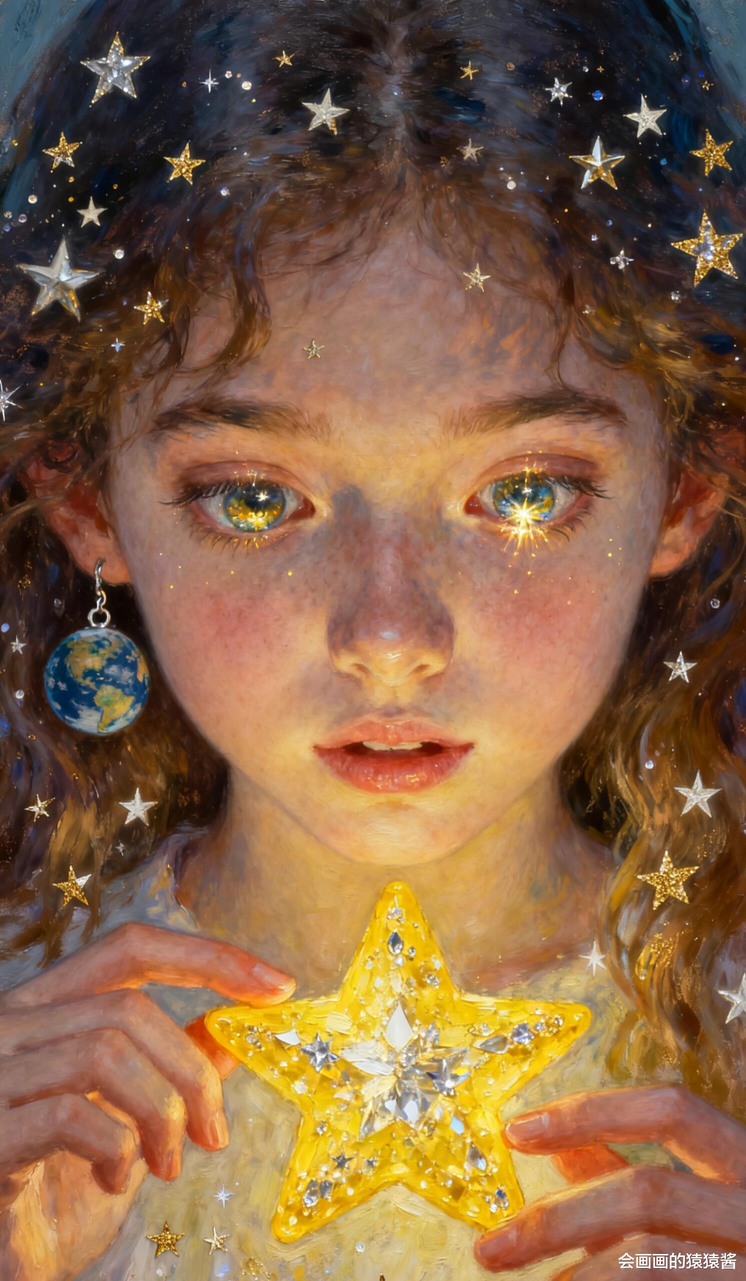 卷发丝间缀满星星、眼眸漾着碎光的梦幻画作