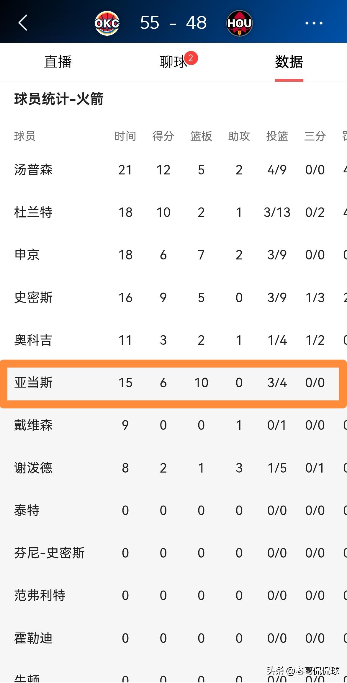 火箭中锋亚当斯真是让人赞不绝口!在今天进行的火箭和雷霆的焦点战中,目前双方的上半场比赛已经结束,虽然火箭暂时以48:55落后对手7分,但是亚当斯的表现却是无可争议的,尤其是他在前场篮板球方面的表现更是无可挑剔。 在前两节比赛中,亚当斯替补出战15分钟,投篮4中3得到6分10篮板1盖帽,其中包括6个前场篮板。 值得一提的是,在上半场比赛中,亚当斯一个人的前场篮板就超过了雷霆全队的前场篮板,雷霆全队在上半场比赛中一共有4个前场篮板。