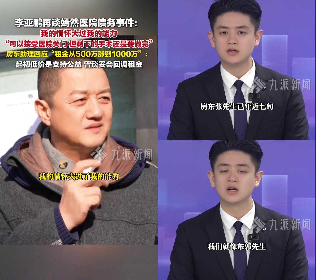 李亚鹏说“情怀大过能力”,可房租翻倍的事比情怀更让人在意。 嫣然医院的纠纷其实特简单:李亚鹏承认扛不住可能关门,但要做完剩余手术;房东说之前是公益低价,现在要回调到1000万一年。结果大家反应强烈,没有骂房东,反而骂九派新闻帮房东洗地,还有人算房租账:望京现在商业租金普遍4-8块一平米,医院5000多平,合同里80万一个月(年960万),比市场合理价高了快一倍。 九派新闻这波操作真迷,明明李亚鹏没怪房东,偏要把房东写成支持公益的七旬老人,合着公益变涨价的借口?还有房租这事儿,疫情后市场都下行,商铺都在降租,十年前谈的回调,现在市场变了还按原价要,这叫合理?有人替李亚鹏喊冤:“他从没说房东不好,就是自己扛不住了”;有人骂媒体:“把房东写成老人博同情,当观众瞎?”还有人算细账:“就算之前低价是公益,现在高于市场一倍,不是趁火打劫是什么?” 最寒心的是,公益不是用来反杀的。李亚鹏的“情怀大过能力”是无奈,可房东拿公益当涨价的由头,媒体拿立场当流量的工具,才是真的让人难受。毕竟公益是我愿意扛,不是你趁机宰,更不是媒体帮着洗。李亚鹏没怪谁,可大家的眼睛亮着,这房租,真的不合理;这媒体,真的偏了心。