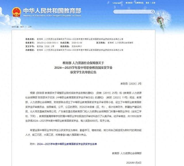近日,教育部、人力资源社会保障部发布关于2024—2025学年度中等职业教育国家奖学金获奖学生名单的公告。根据公告,共19992名学生获得2024—2025学年度中等职业教育国家奖学金,每人奖励6000元。