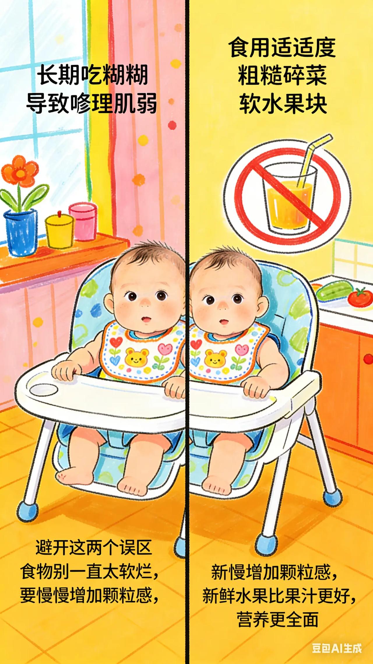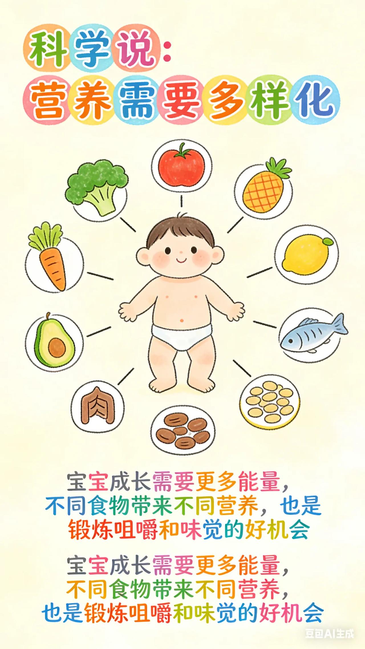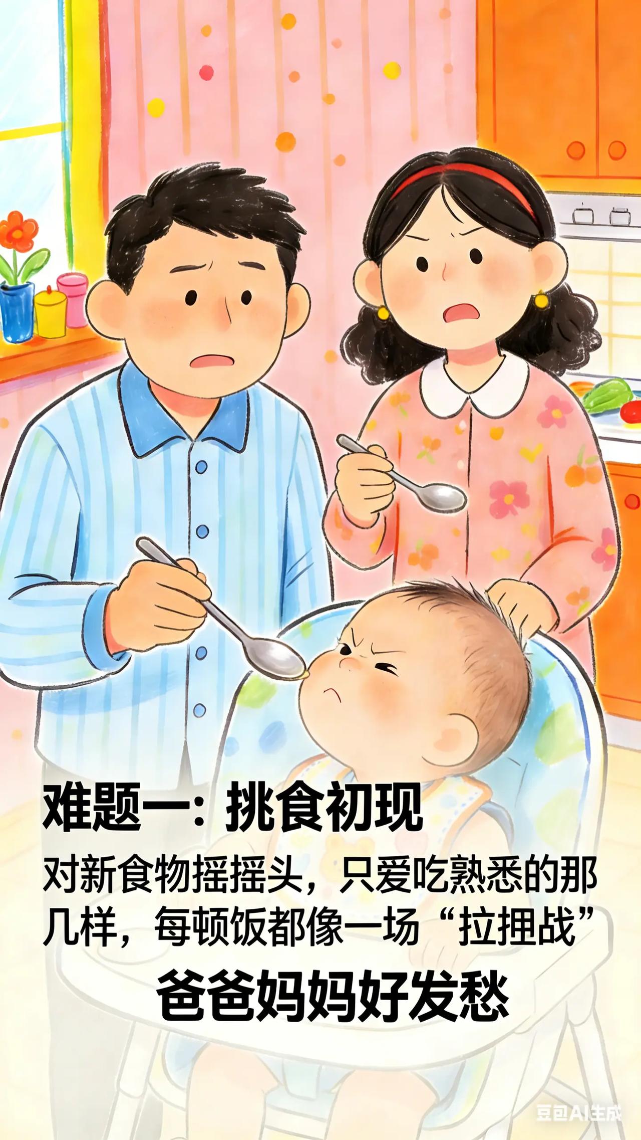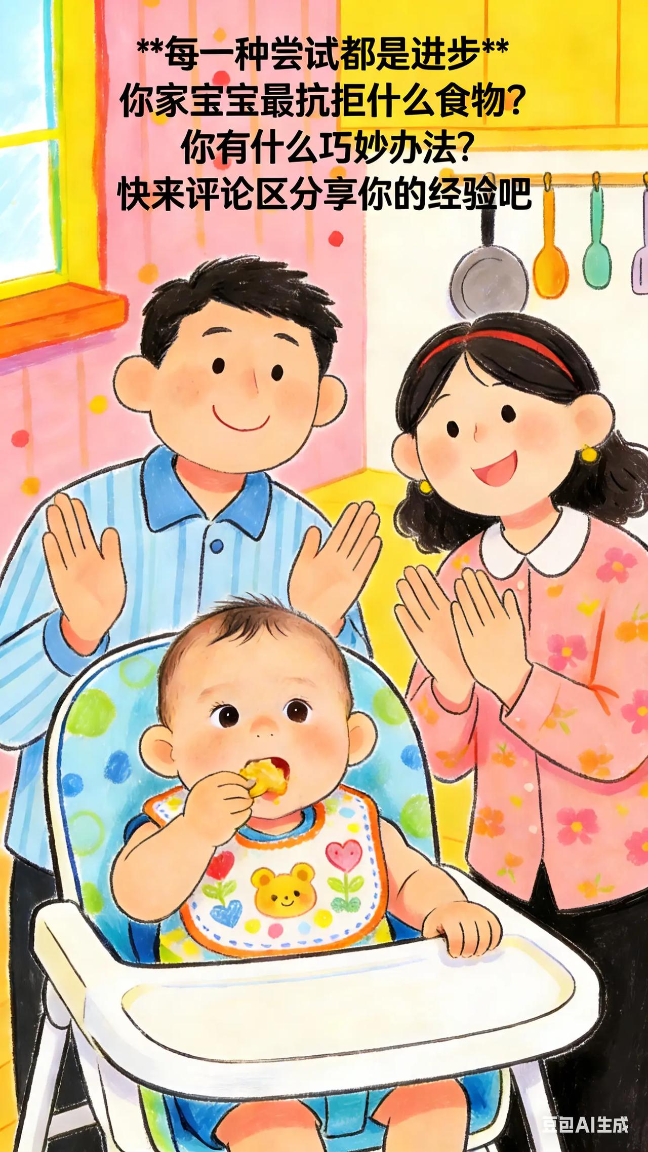 0-3岁喂养与饮食:4.解锁辅食新阶段 。宝宝 7 - 9 个月了,吃了一段时间辅食,家长想给宝宝丰富辅食种类,却担心宝宝不接受新食物。而且,宝宝开始对食物挑挑拣拣,喂饭成了难题,不知道怎样让宝宝尝试更多食物。科学原理此阶段宝宝营养需求增加,需要摄入更多种类食物以获取全面营养。宝宝出现挑食,可能是对新食物口感、味道不熟悉,也可能是喂养方式不当。多样化食物可刺激宝宝味觉、嗅觉和咀嚼能力发展。具体方法引入新食物:继续添加不同蔬菜、水果,还可尝试肉类、鱼类、豆类等。如鸡肉泥,将鸡肉洗净、煮熟,打成泥状。添加新食物时,与宝宝熟悉的食物混合,降低宝宝接受难度。每次添加量由少到多,观察宝宝反应。培养良好进食习惯:固定进餐时间和地点,营造安静舒适进餐环境。给宝宝准备专用餐具,让宝宝参与进食过程,如自己抓握食物。不要强迫宝宝进食,当宝宝表示吃饱或不想吃时,不要强行喂饭。常见误区误区一:只给宝宝吃软烂食物。长期吃软烂食物不利于宝宝咀嚼能力发展,可逐渐增加食物颗粒感,如从菜泥过渡到碎菜。误区二:用果汁代替水果。果汁在制作过程中损失了膳食纤维,且含糖量相对较高,不能完全替代水果,应尽量给宝宝吃新鲜水果。你家宝宝最抗拒的食物是什么?你是怎么让 Ta 尝试接受的?分享一下经验。新手妈妈 育儿经验分享 新手爸妈必看 宝宝辅食