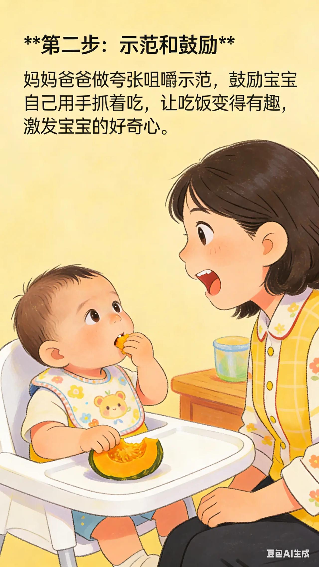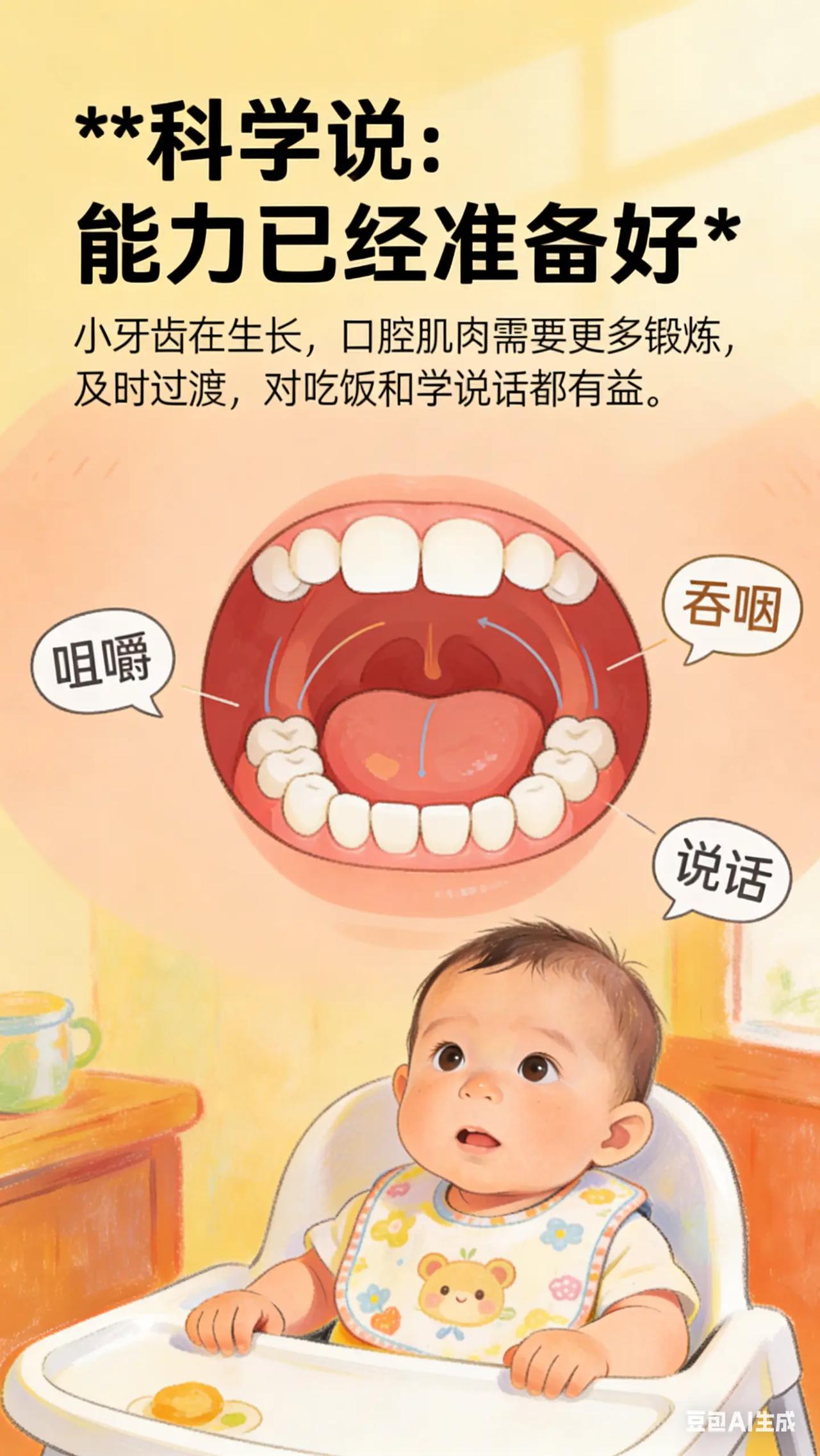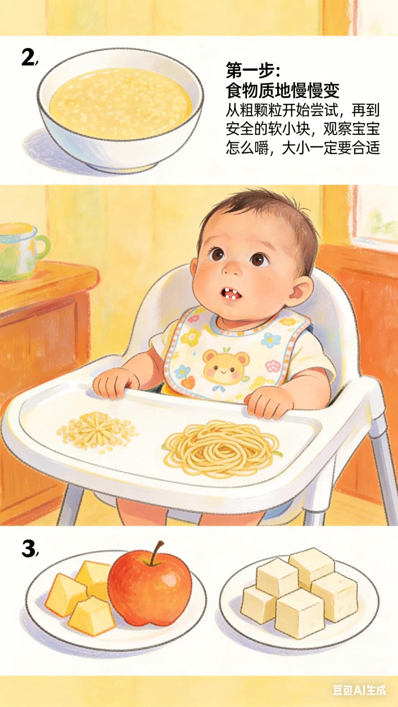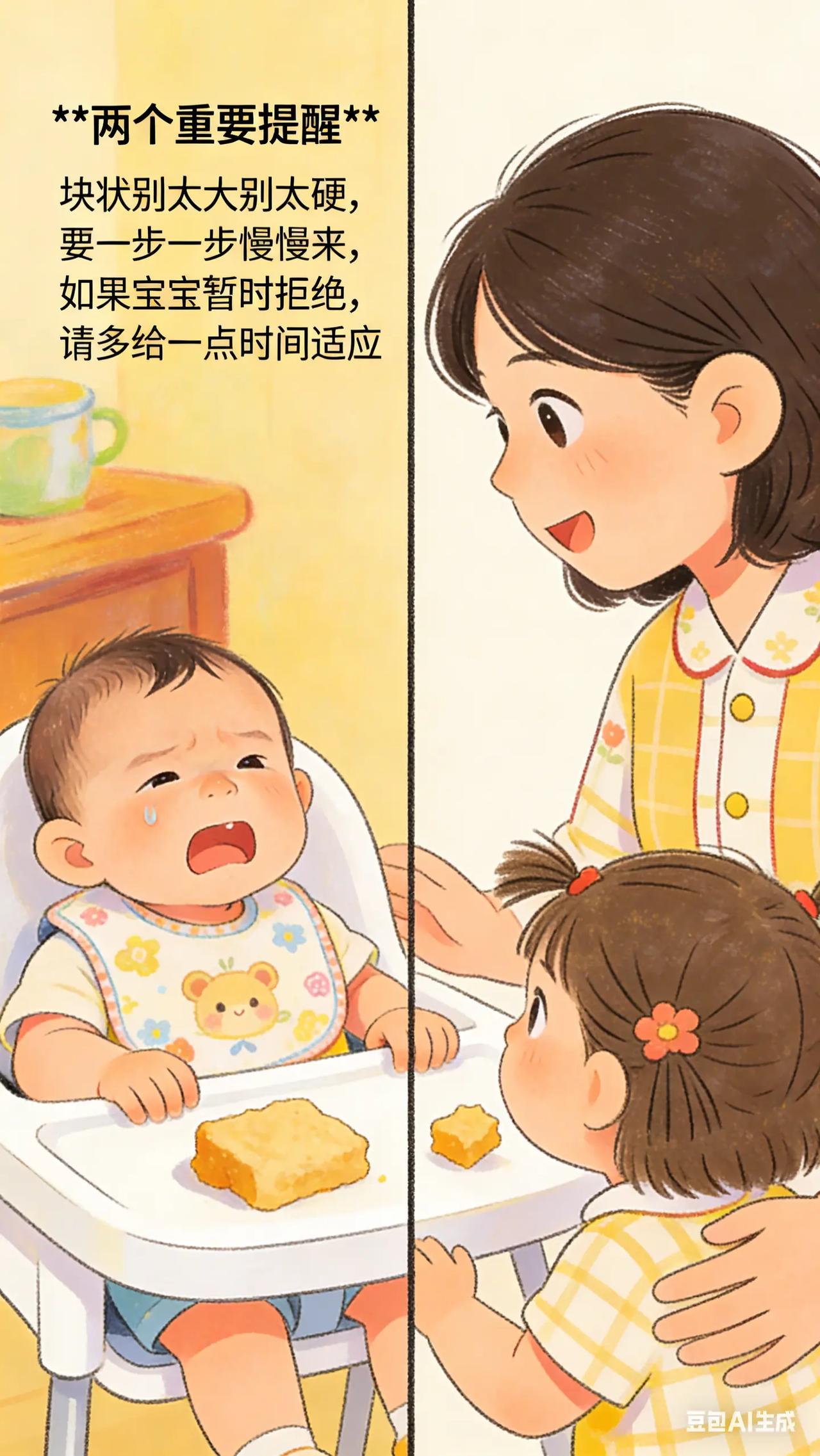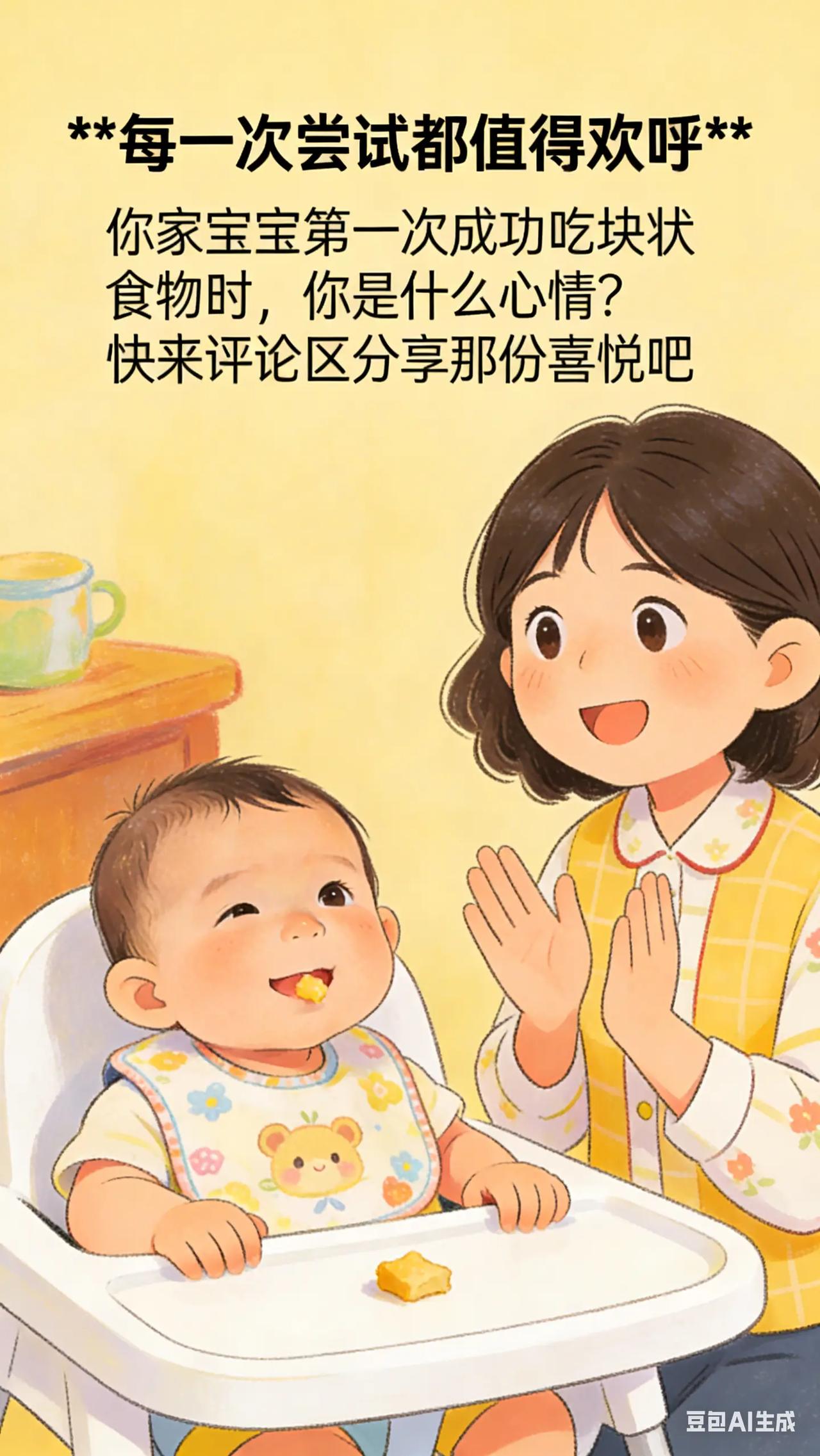 0-3岁喂养与饮食:5.咀嚼新挑战。宝宝 10 - 12 个月,眼看其他宝宝都能吃块状食物了,自家宝宝还只吃泥糊状食物,家长着急想帮宝宝过渡,又怕宝宝咀嚼、吞咽困难,担心卡到宝宝。科学原理10 - 12 个月宝宝口腔肌肉和咀嚼能力进一步发展,具备从泥糊状食物向块状食物过渡的能力。及时过渡有助于锻炼咀嚼和吞咽功能,促进牙齿生长和语言发育。但过渡过程需循序渐进,根据宝宝个体情况调整。具体方法逐渐改变食物质地:从稍粗的颗粒状食物开始,如小米粥里的小米颗粒、切碎的软面条。观察宝宝咀嚼和吞咽情况,适应后再过渡到小块状食物,如苹果切成小方块、豆腐切成小块。食物大小以宝宝能安全咀嚼和吞咽为宜。示范咀嚼动作:家长在宝宝面前夸张地咀嚼食物,引导宝宝模仿。同时,鼓励宝宝自己用手抓握块状食物进食,提高宝宝进食兴趣和积极性。常见误区误区一:过渡太快。如果块状食物过大或质地过硬,宝宝咀嚼不充分就吞咽,容易卡喉,务必根据宝宝咀嚼能力逐步过渡。误区二:忽视宝宝反应。若宝宝对块状食物表现出抗拒或吞咽困难,不要强迫,可适当放缓过渡速度,给宝宝更多时间适应。你家宝宝第一次成功吃块状食物时,你心情如何?快来评论区分享喜悦。育儿经验分享 新手妈妈 新手爸妈必看