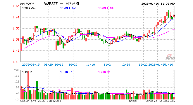 家电ETF(159996)业绩比较基准为中证全指家用电器指数收益率,管理人为国泰基金管理有限公司,基金经理为苗梦羽,成立(2020-02-27)以来回报为59.28%,近一个月回报为5.79%。
