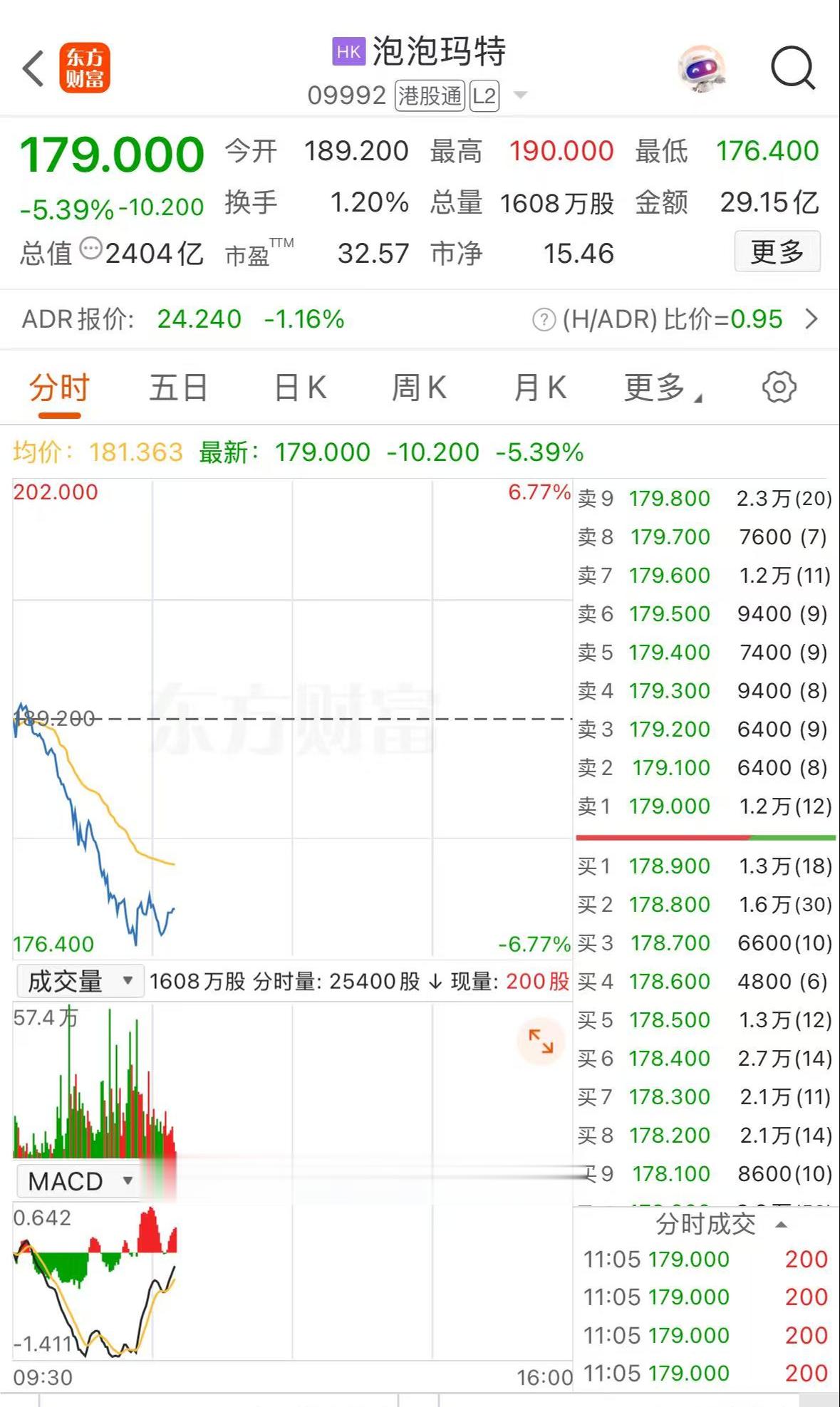 上证报中国证券网讯(记者刘逸鹏)1月16日,泡泡玛特一度跌近7%,截至11时05分,跌幅收窄至5.39%,报179港元/股。