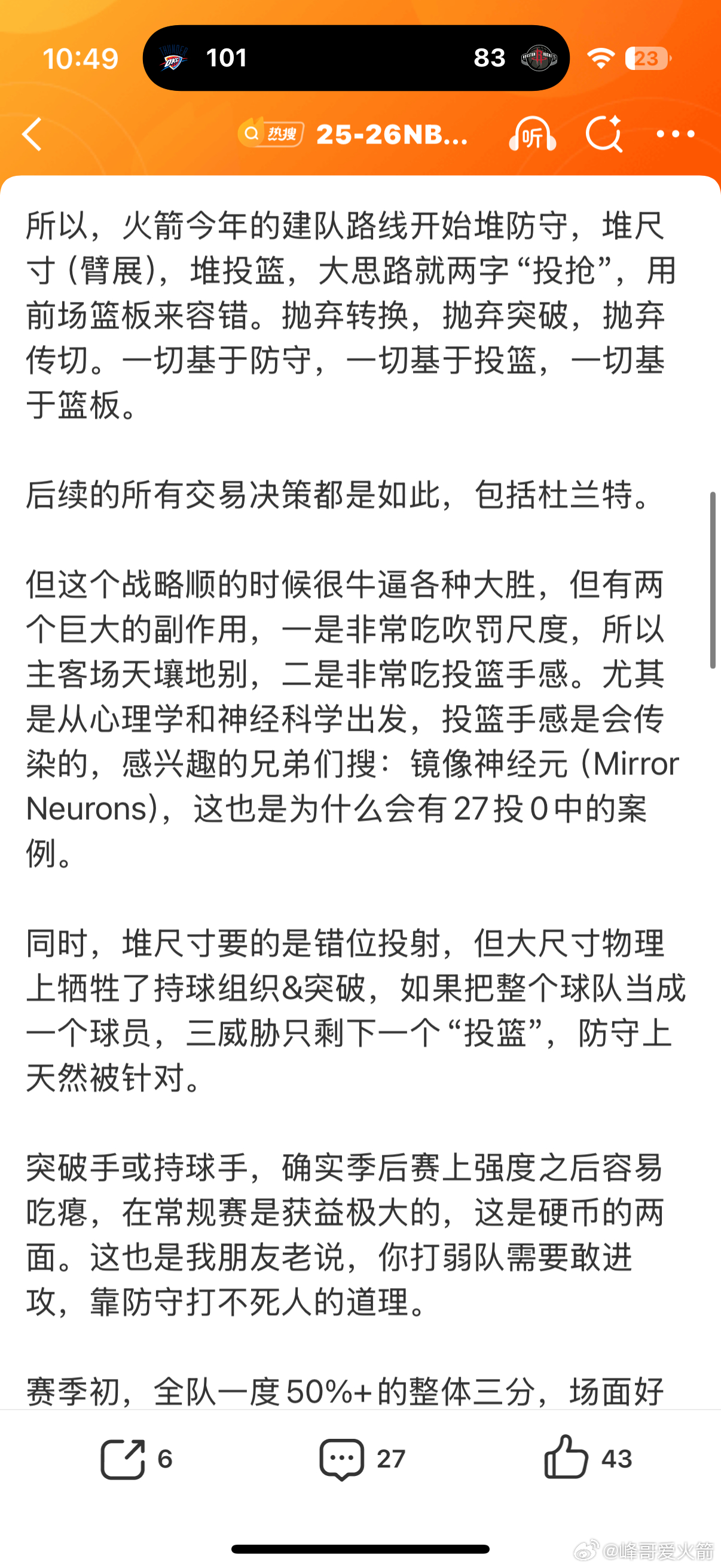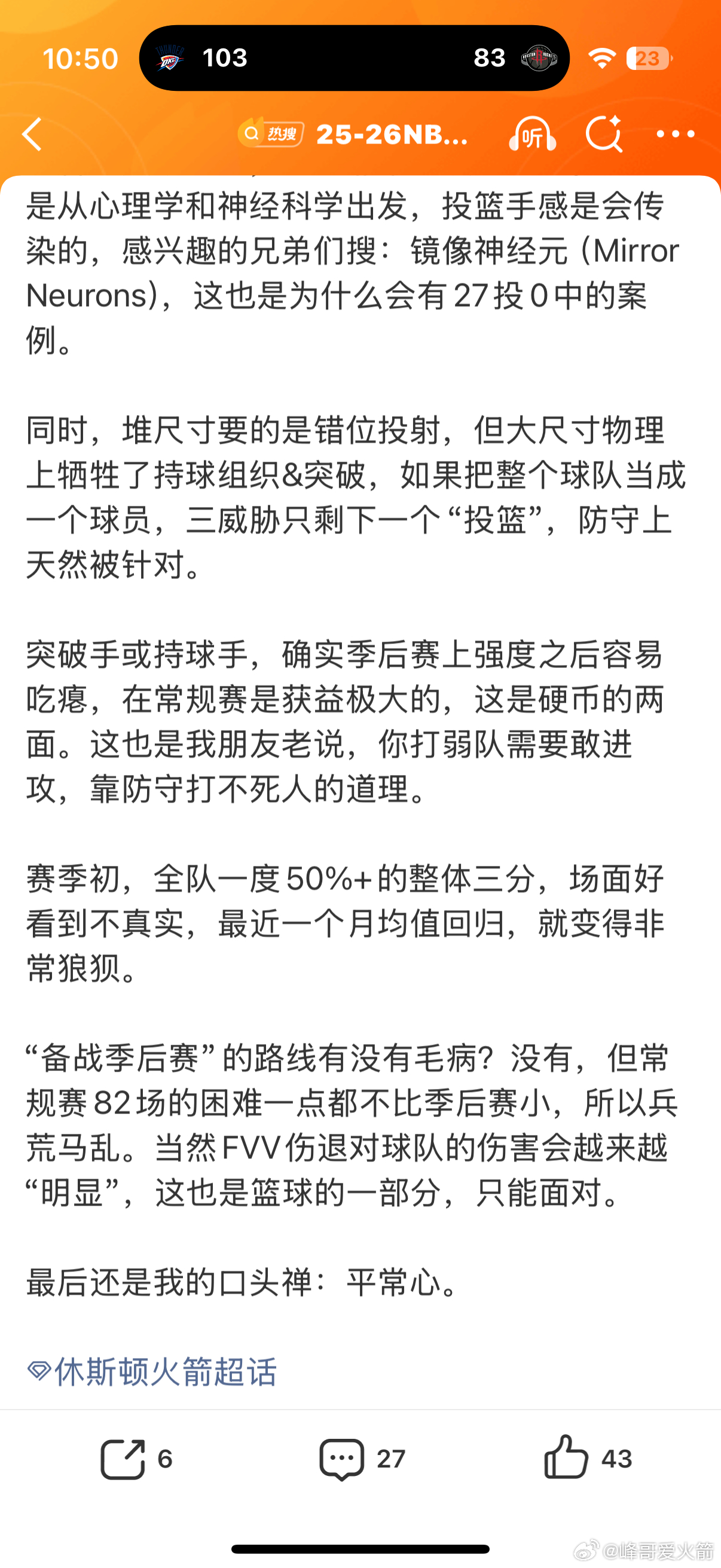 还是那句话,现在的这支球队不存在一定能赢的逻辑,问题是系统性的,心态不好的兄弟们多陪家人多忙工作多玩游戏少看球,比如我。休斯顿火箭