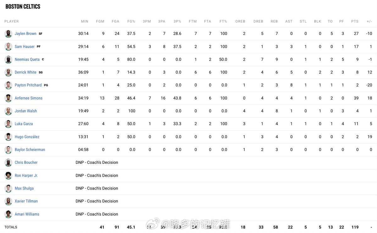 全场比赛数据📊安芬尼-西蒙斯39分4篮板4助攻杰伦-布朗27分7篮板萨姆-豪瑟