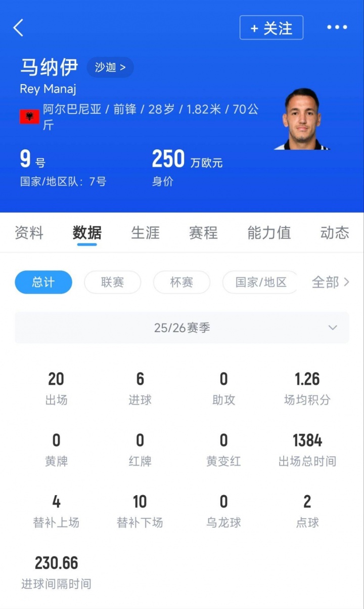 媒体表示,马纳伊将与浙江签约2年,年薪400万欧,他将成为阿尔巴尼亚薪水最高的球员之一。28岁的马纳伊现效力阿联酋的沙迦队,本赛季各项赛事为球队出战20场收获6球。