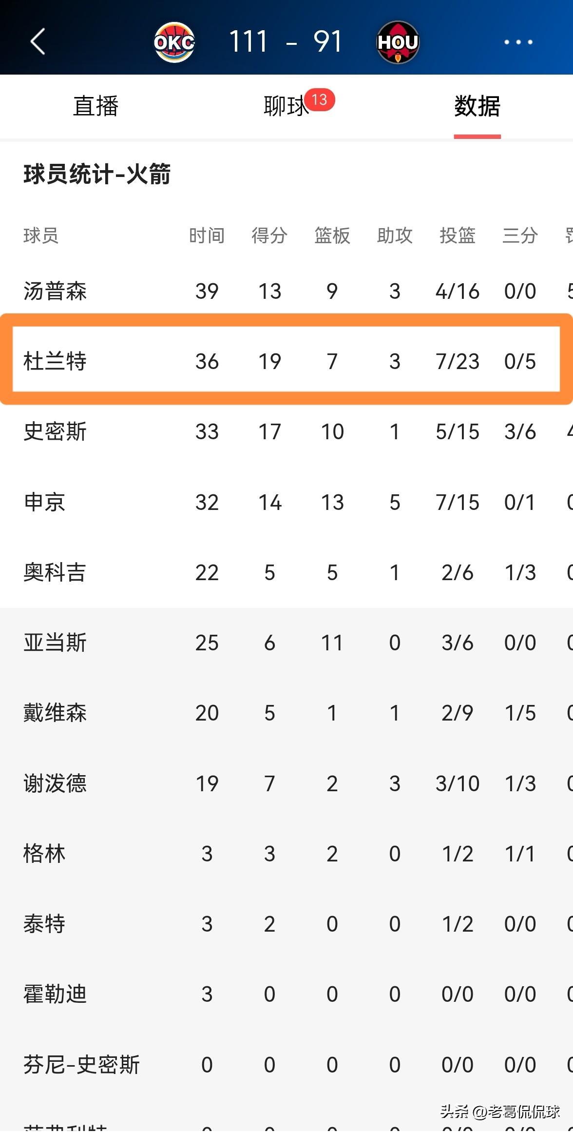 我强烈建议火箭交易走杜兰特!今天火箭在主场以91:111惨败于雷霆,本场比赛杜兰特堪称球队输球的罪魁祸首。整场比赛下来,杜兰特首发出战36分钟,投篮23中7,其中三分球5中0、罚球5中5非常低效的得到19分,还有2次失误,他的场上正负值为全队最低的-20。 无情的事实再次证明,以杜兰特目前的能力来看,他绝对不可能带领火箭夺冠,火箭要想实现夺冠大业,必须交易走杜兰特。