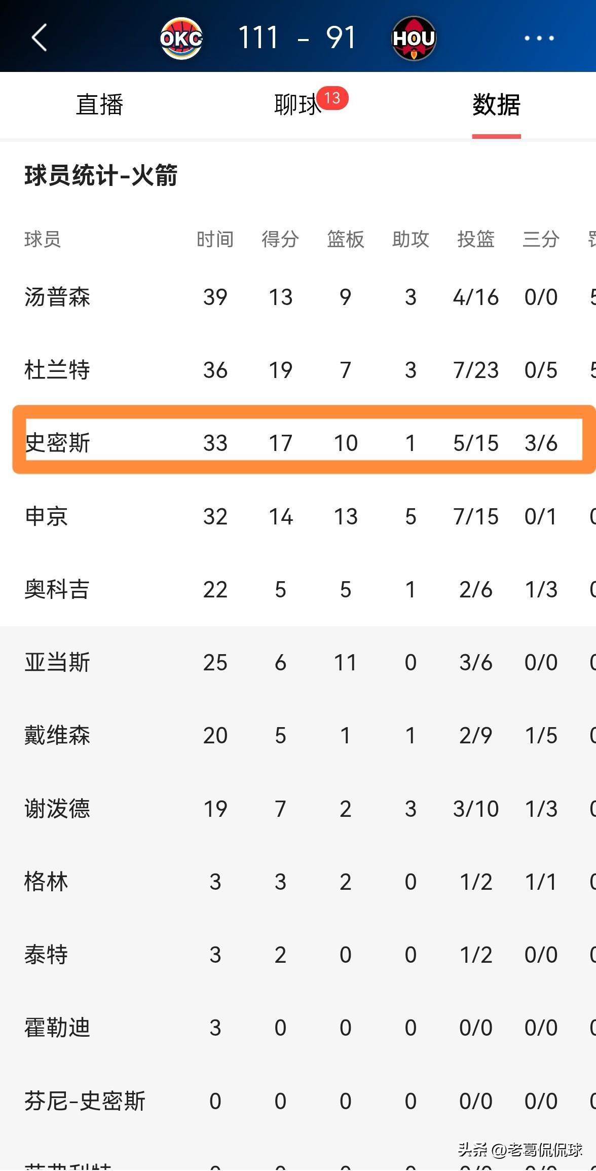 我必须要怒赞火箭大将小史密斯!虽然今天火箭在主场以91:111惨败于雷霆,但是小史密斯成为了球队在三分线外表现最好的球员,如果不是小史密斯命中了三记三分球,火箭会输的更惨。 全场比赛下来,小史密斯首发出战33分钟,投篮15中5,其中三分球6中3、罚球4中4得到17分10篮板1助攻2抢断1盖帽,他的场上正负值为-15。 虽然小史密斯的整体进攻效率不高,但是他依然是火箭阵中表现最好的球员之一,本场比赛小史密斯的表现要强于杜兰特、阿门-汤普森、戴维森等铁匠。
