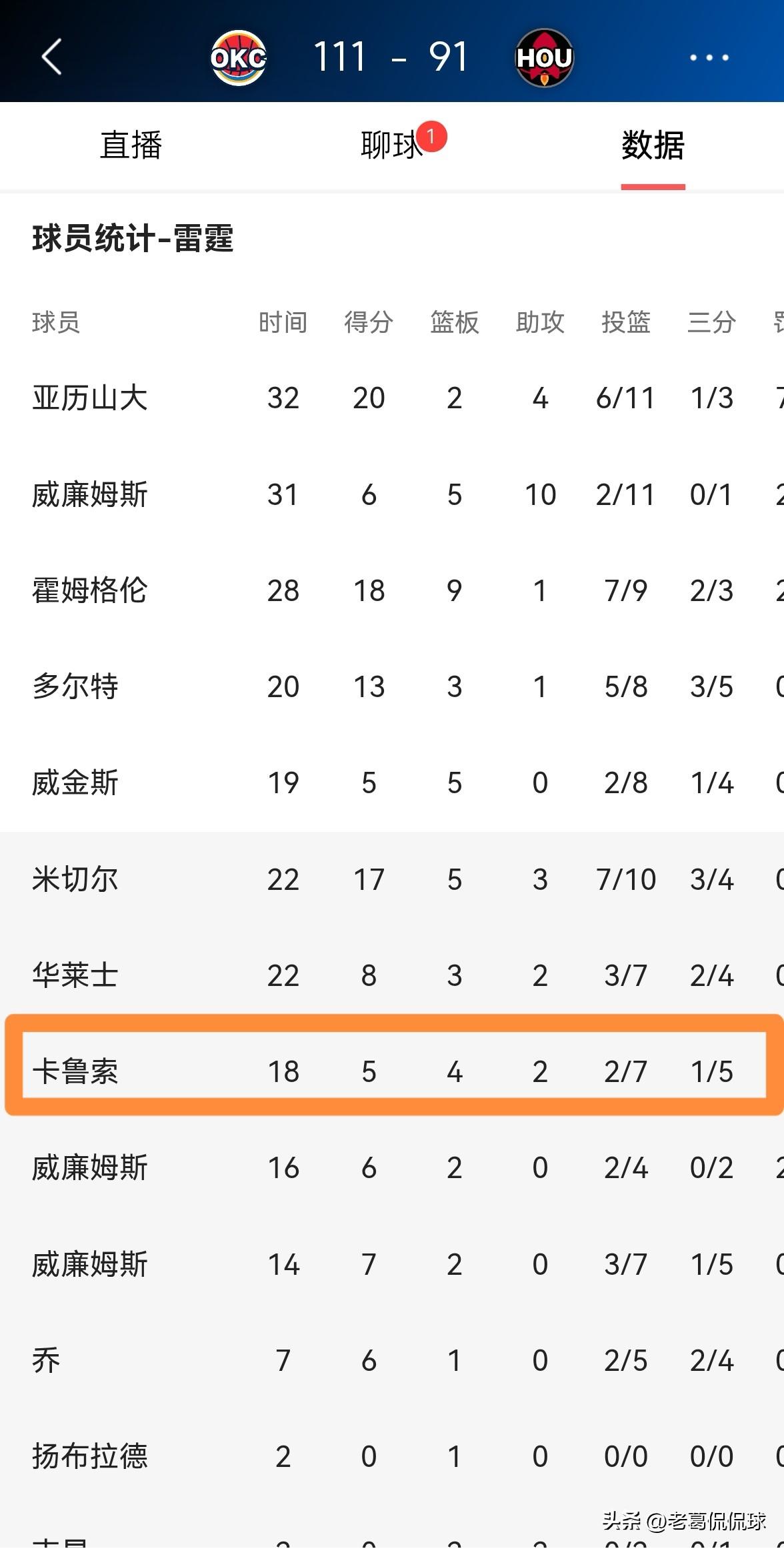 雷霆大将卡鲁索真是不可或缺!在今天雷霆客场以111:91大胜火箭的比赛中,虽然卡鲁索的进攻效率一般,但是他依然是球队不可或缺的球员之一,他在防守端为球队提供了巨大的帮助,尤其是卡鲁索对杜兰特的防守非常成功。 全场比赛下来,卡鲁索替补出战18分钟,投篮7中2,其中三分球5中1得到5分4篮板2助攻2抢断1盖帽,他的场上正负值为+12。 这就是卡鲁索在雷霆的价值,虽然他在进攻端表现低迷,但是卡鲁索依然是主帅戴格诺特眼中的香饽饽。