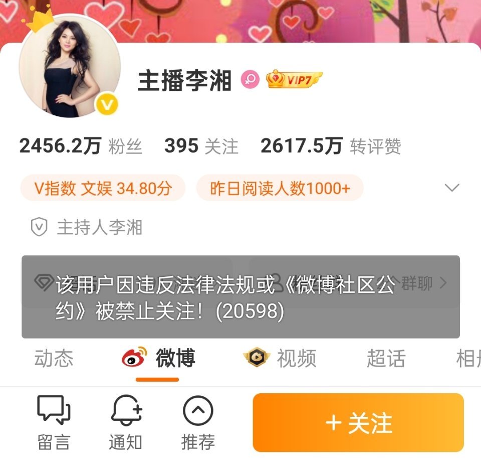 🔻李湘被禁止关注了。什么情况?李湘全平台账号被禁止关注