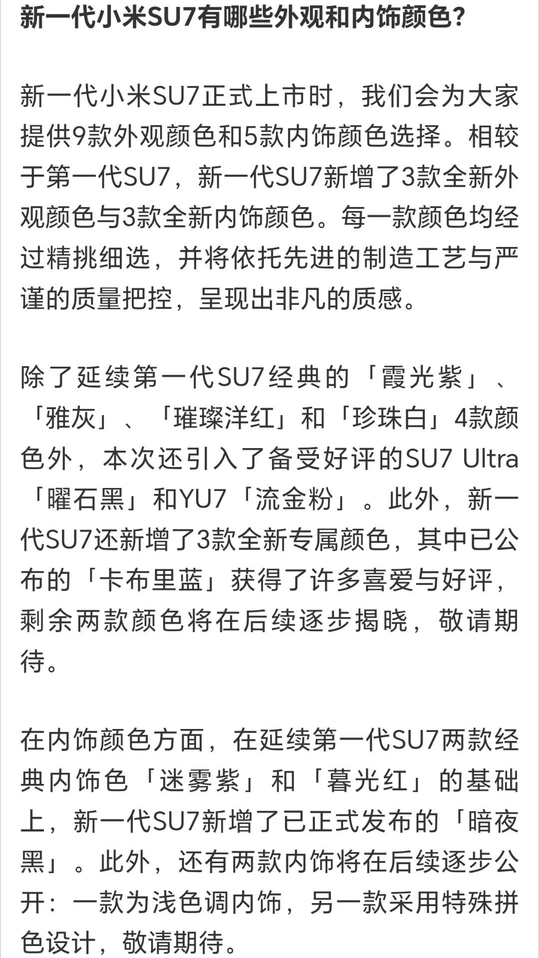 昨晚雷总的直播,公布了更多新一代SU7的配置信息。9款外观配色,内饰上有5款,第一代的2款,增加暗夜黑,还有2款内亮相;轮毂有6款可选,搭载V6s Plus超级电机。另外还有3年0息或者7年低息的政策等。新一代性价比依旧会拉满。已锁单还没交付的可以限时转成新一代,你会继续等么?新一代小米SU7九款颜色公布